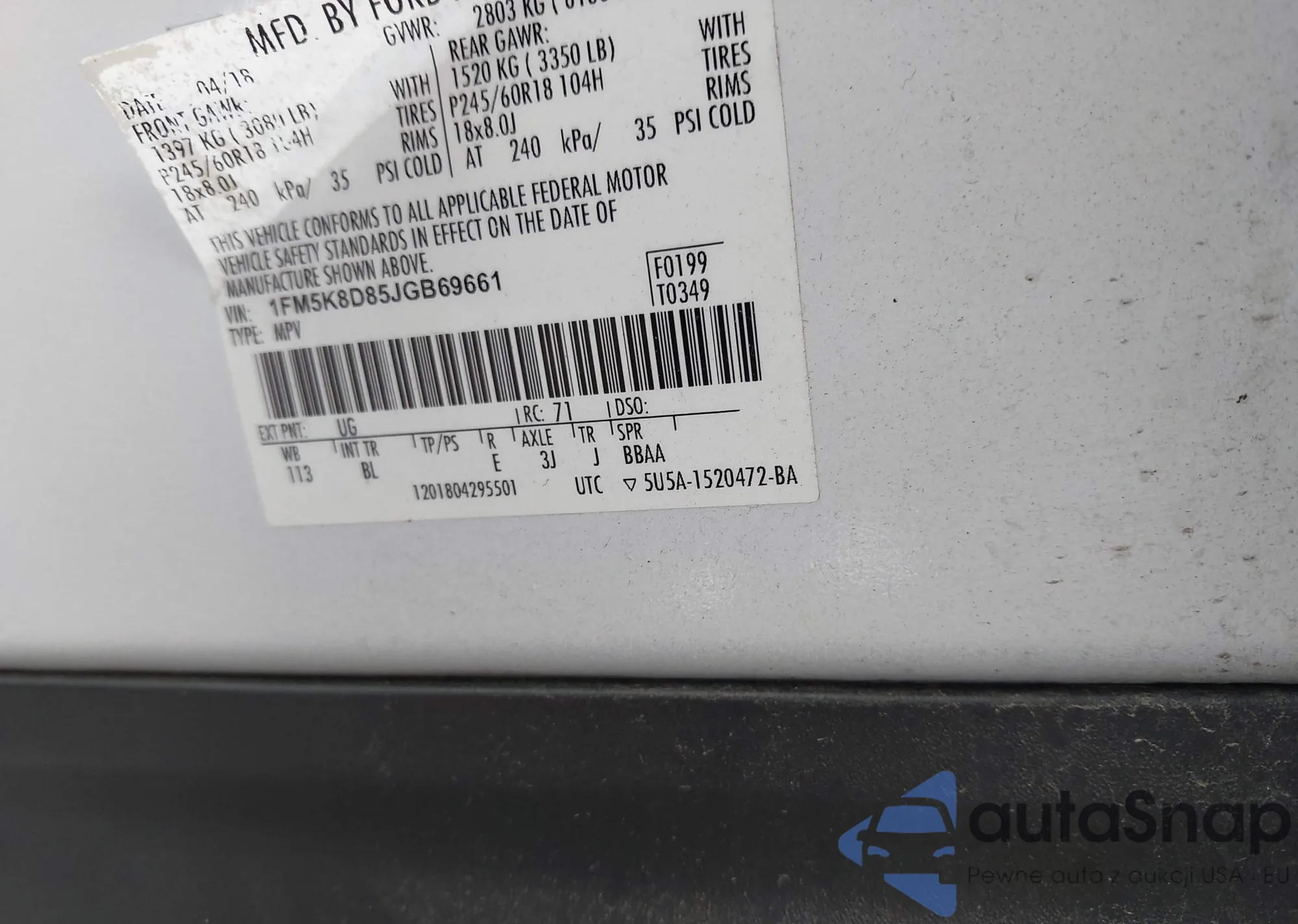 LOT: 43026516 VIN: 1FM5K8D85JGB69661
