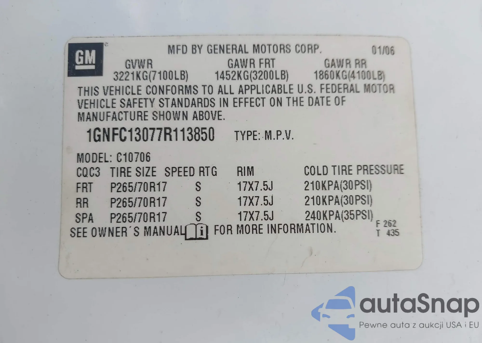 LOT: 42845649 VIN: 1GNFC13077R113850