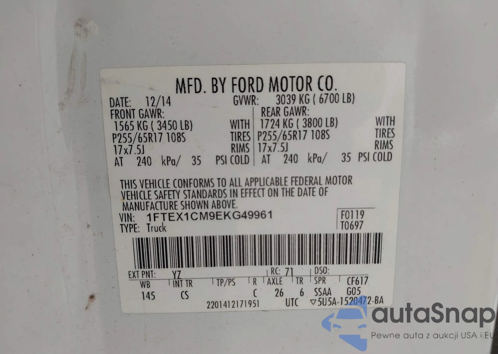 LOT: 43056635 VIN: 1FTEX1CM9EKG49961