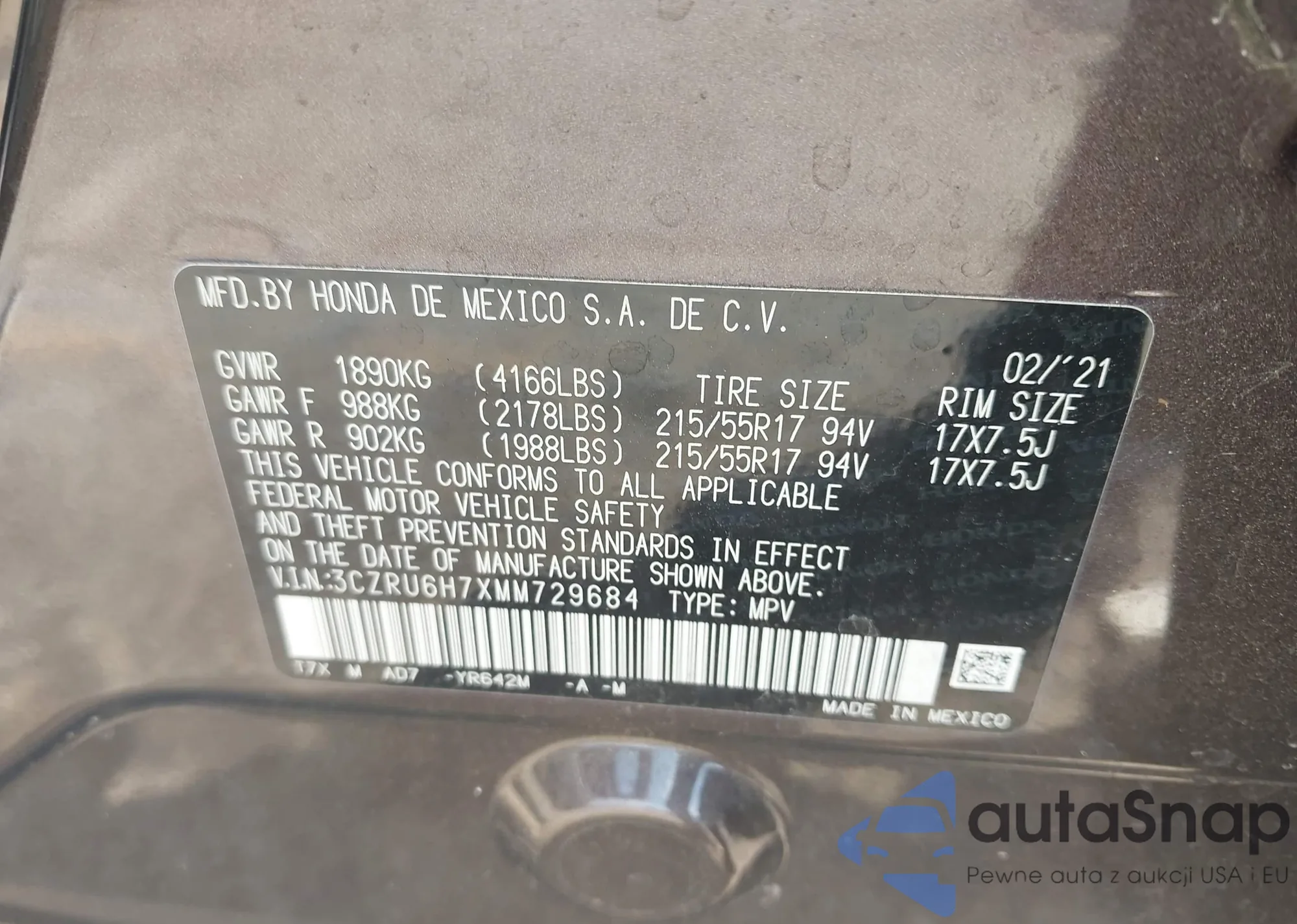 • VIN 3CZRU6H7XMM729684