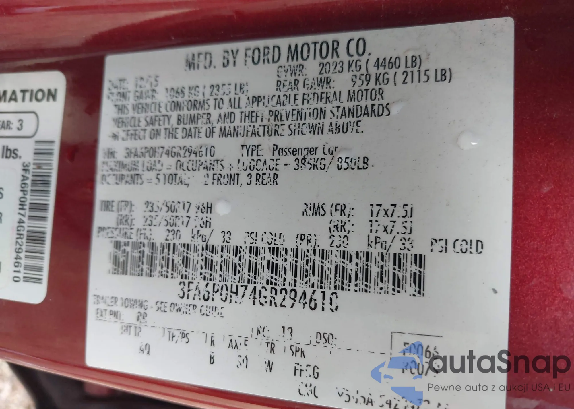 LOT: 43167287 VIN: 3FA6P0H74GR294610