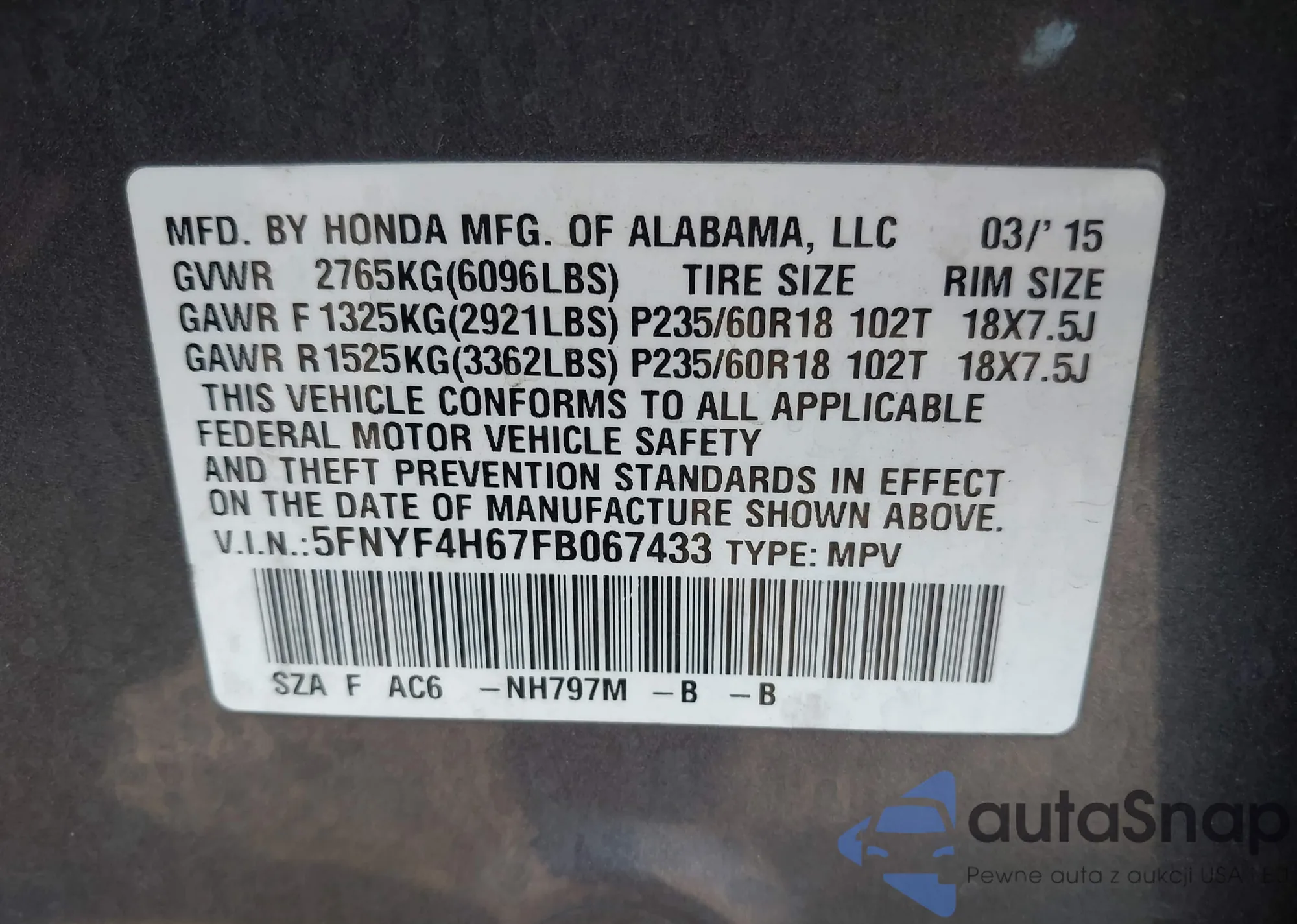 • VIN 5FNYF4H67FB067433