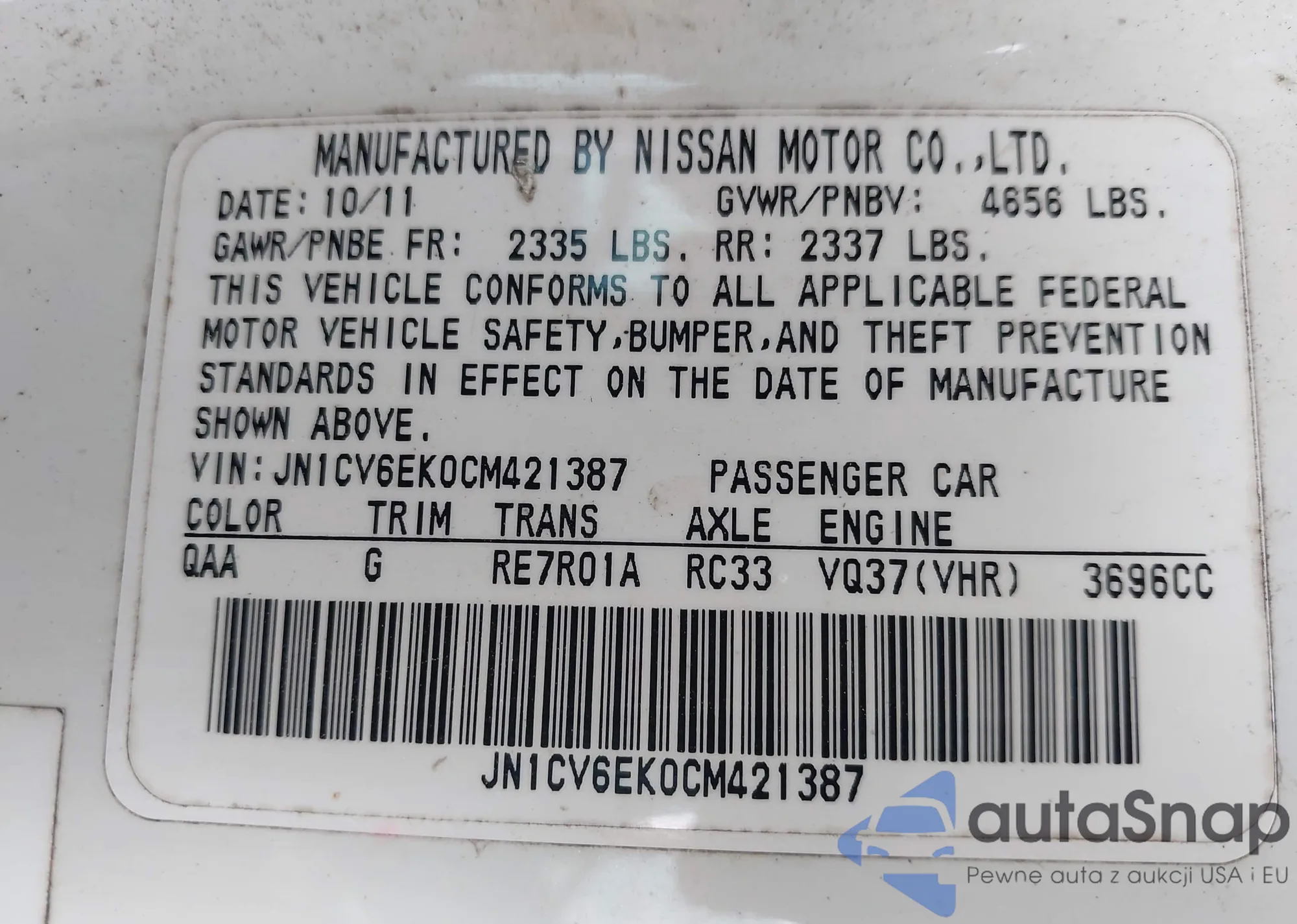 LOT: 43059392 VIN: JN1CV6EK0CM421387