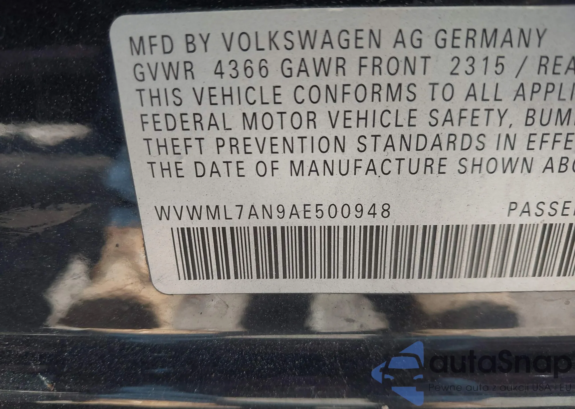 • VIN WVWML7AN9AE500948