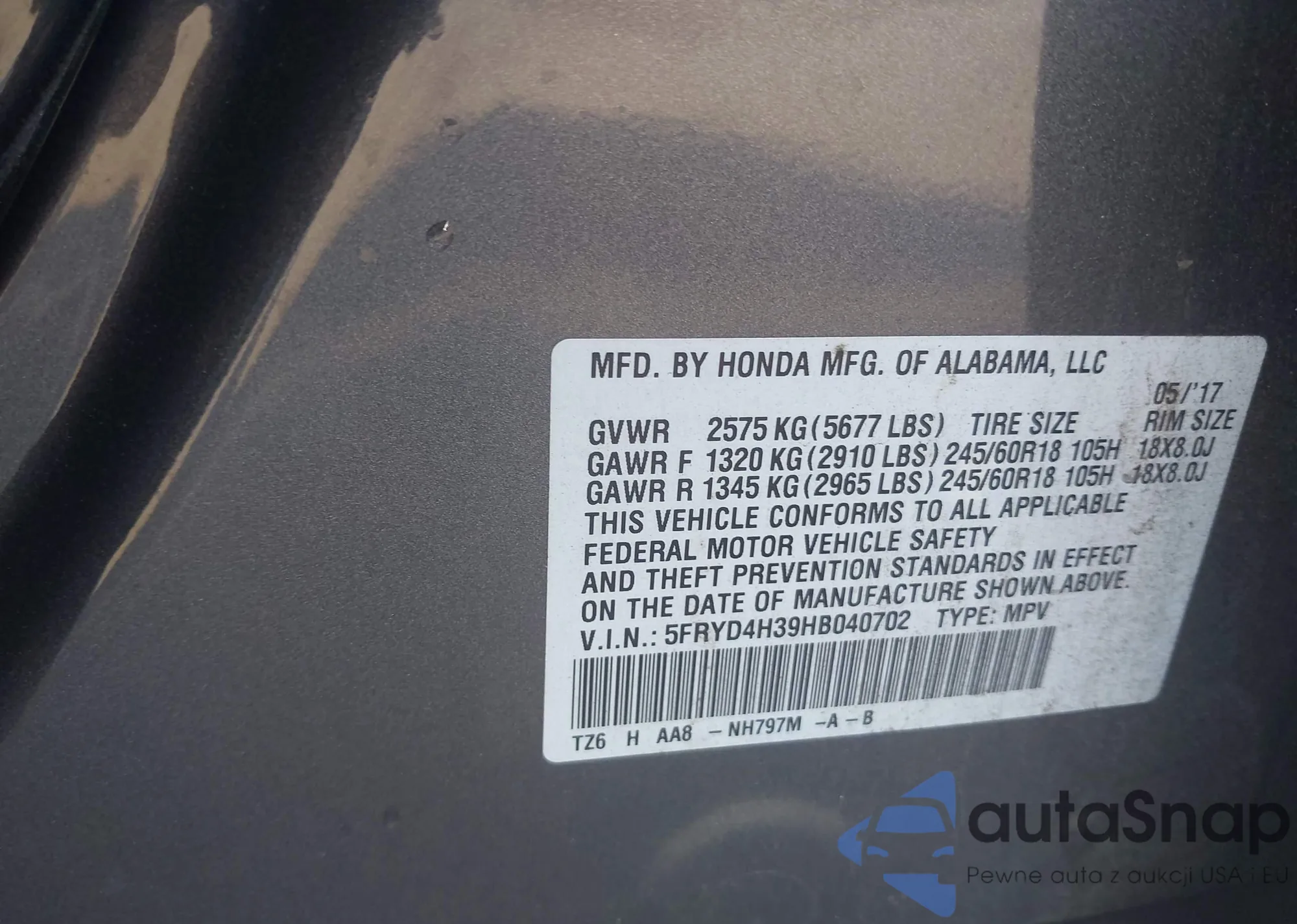 • VIN 5FRYD4H39HB040702