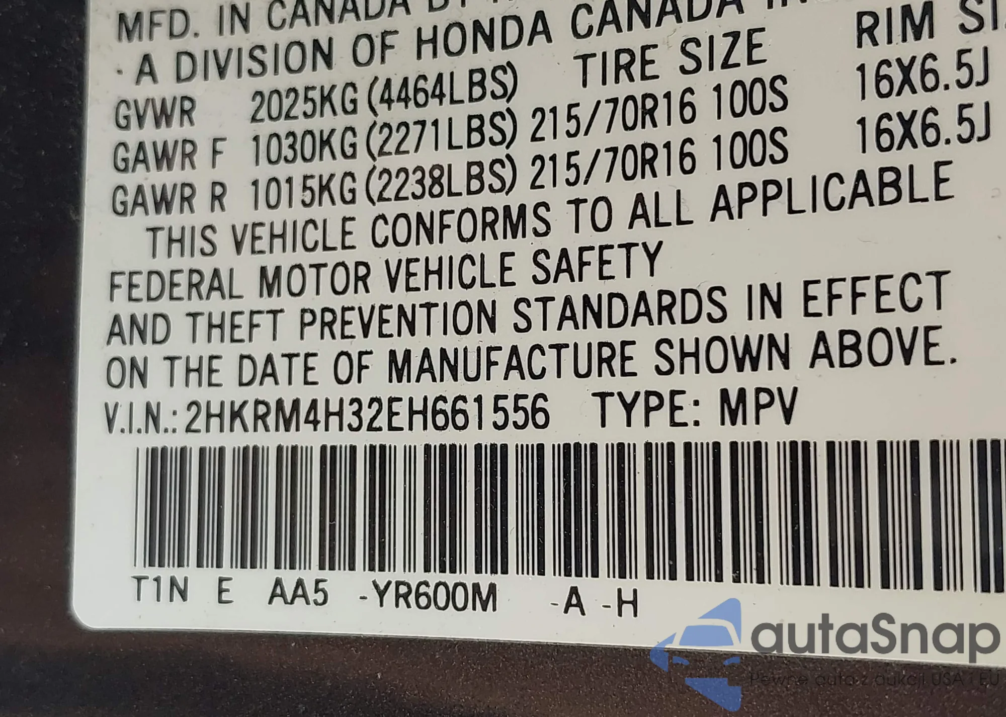 • VIN 2HKRM4H32EH661556