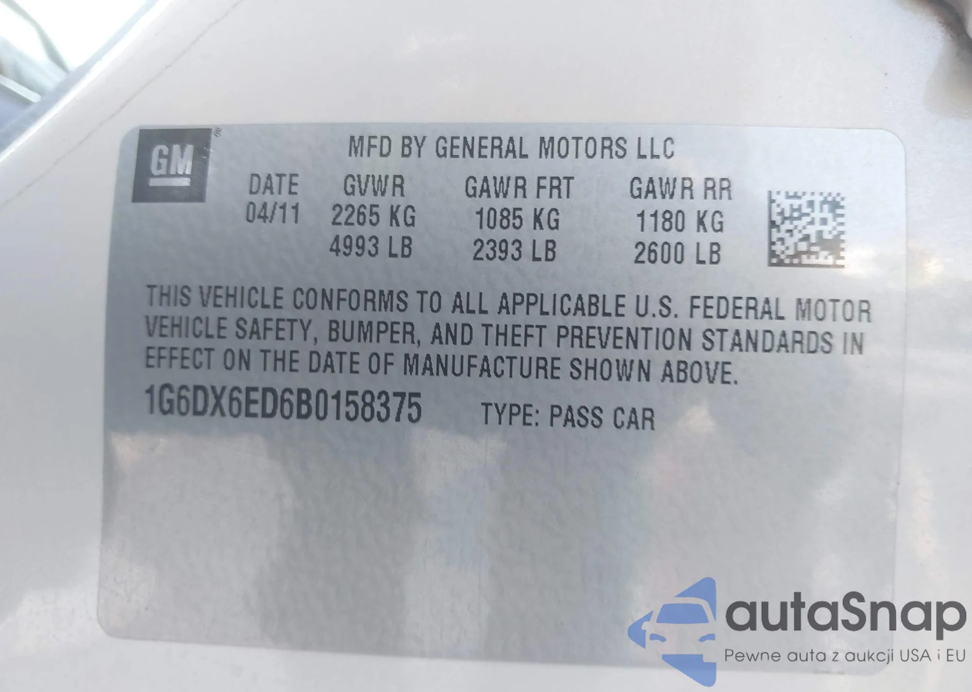 LOT: 42918179 VIN: 1G6DX6ED6B0158375