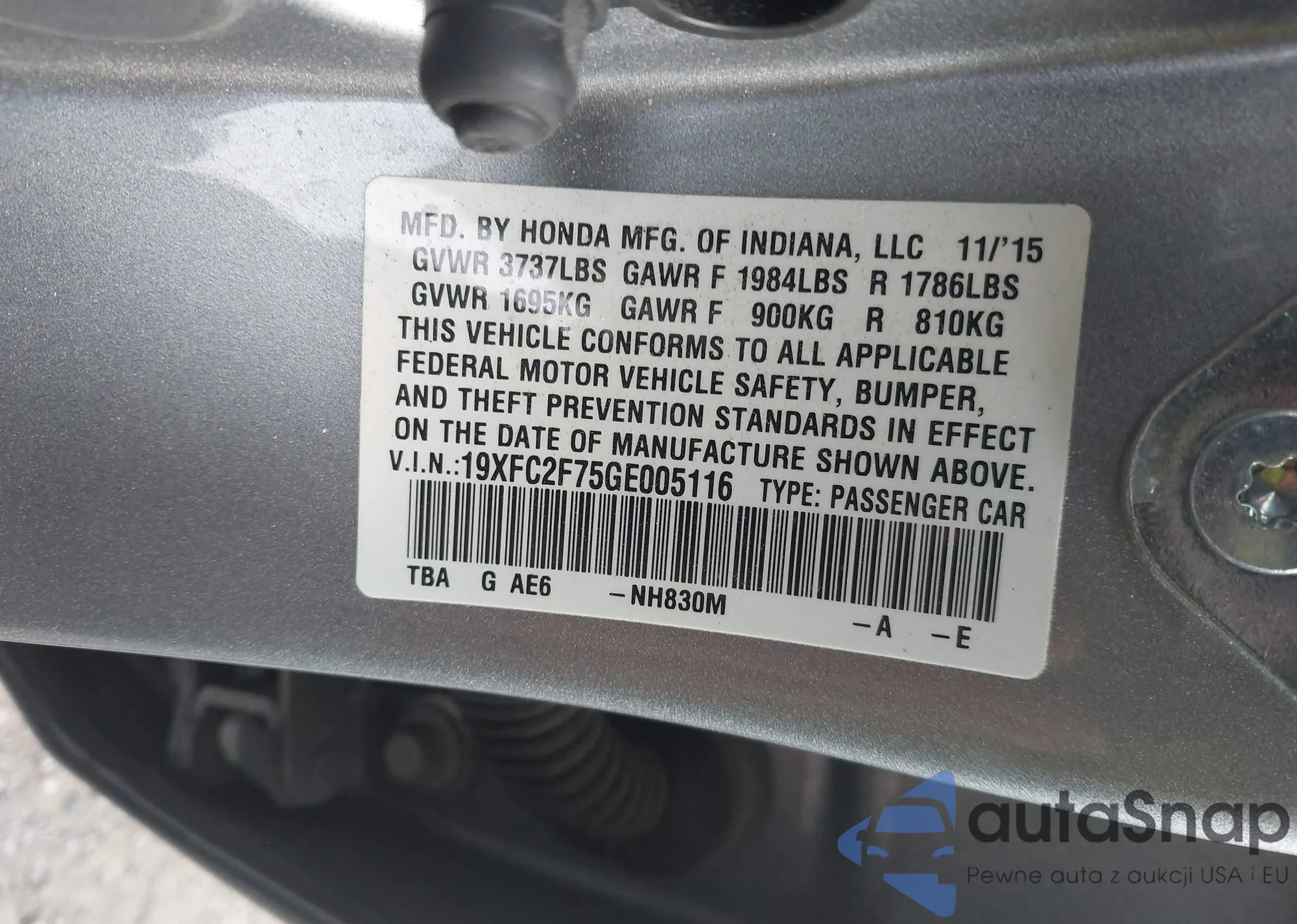 LOT: 42950233 VIN: 19XFC2F75GE005116