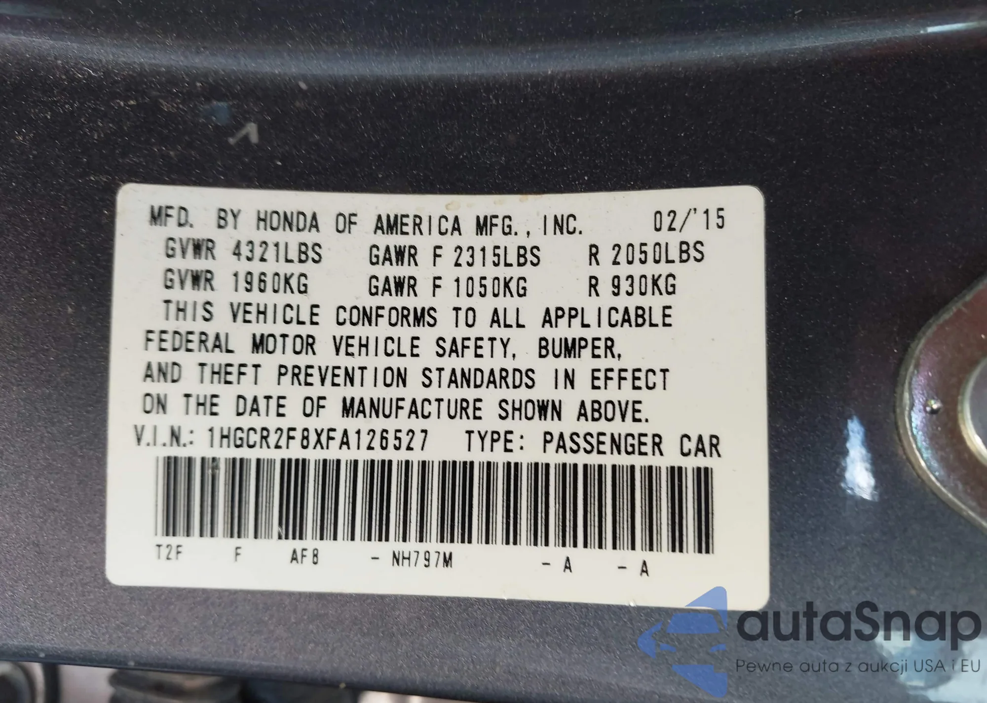 LOT: 43007478 VIN: 1HGCR2F8XFA126527