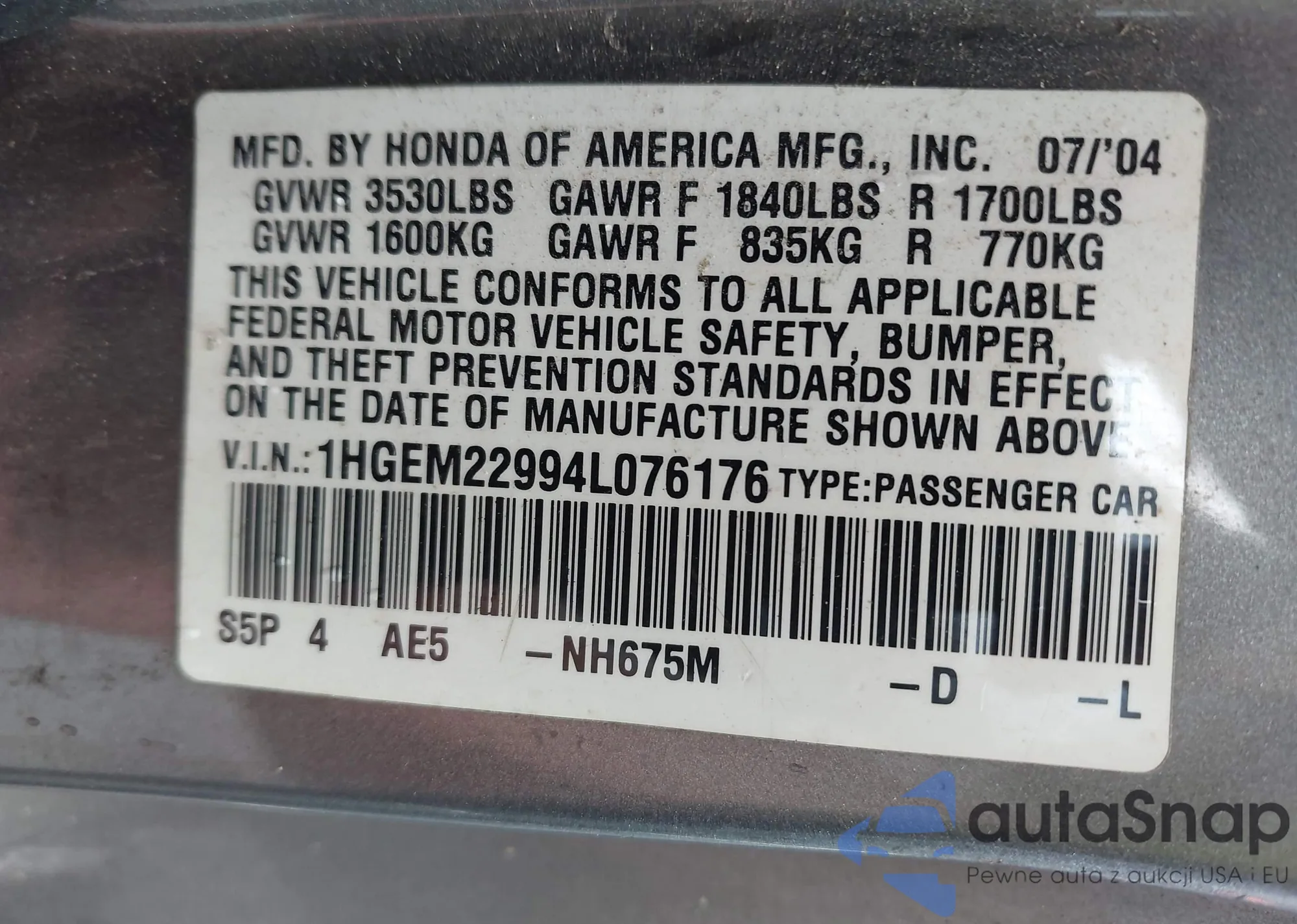 LOT: 42996023 VIN: 1HGEM22994L076176