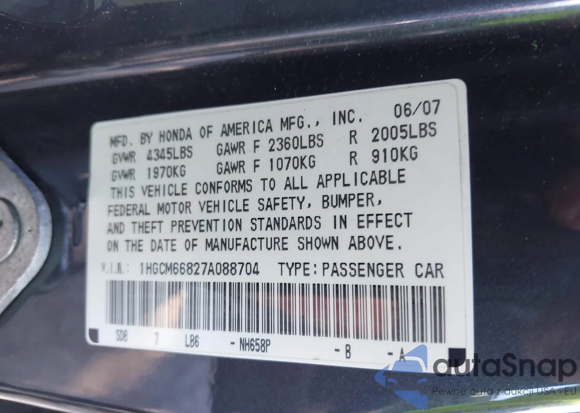 LOT: 43132812 VIN: 1HGCM66827A088704