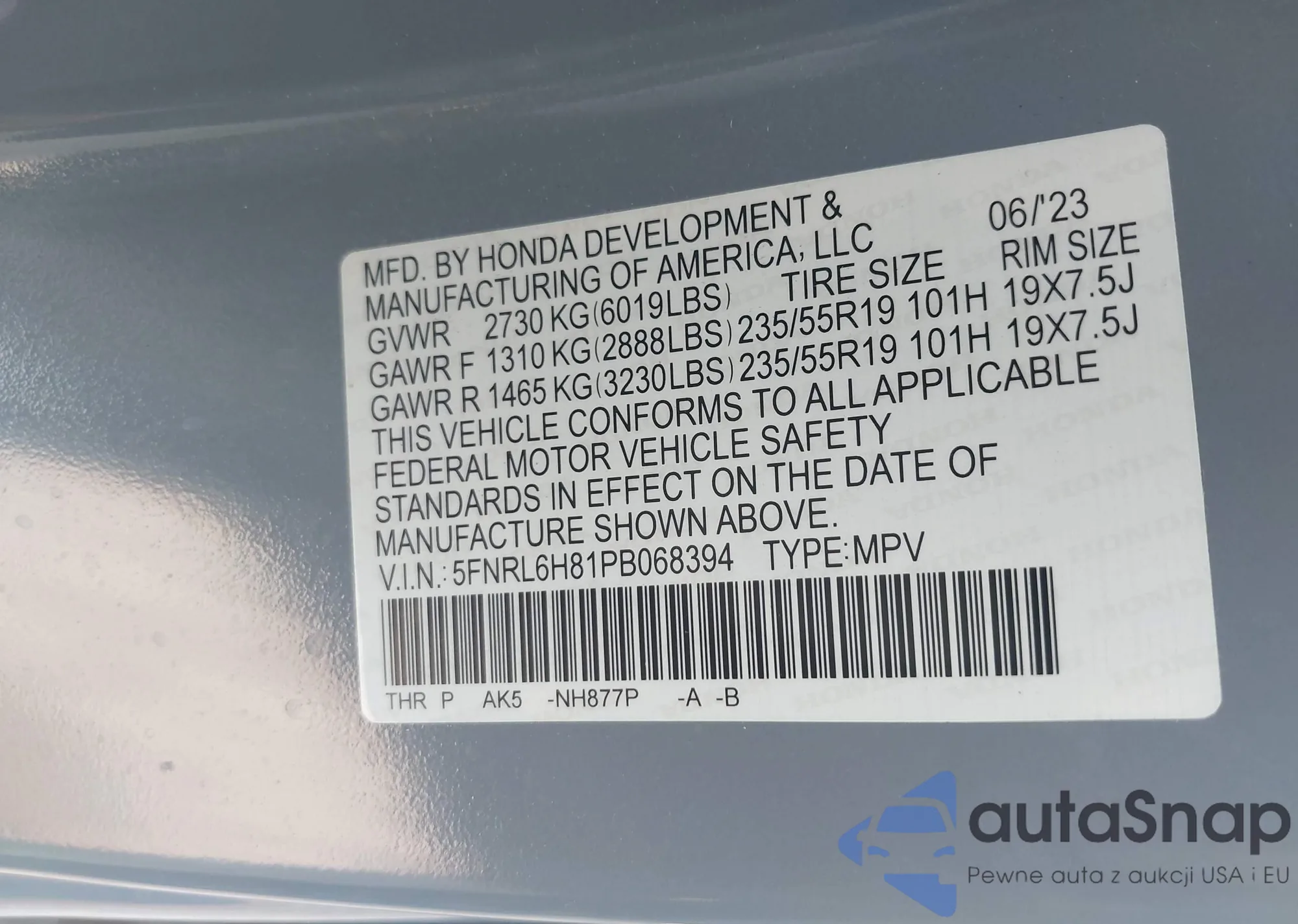 LOT: 42728735 VIN: 5FNRL6H81PB068394