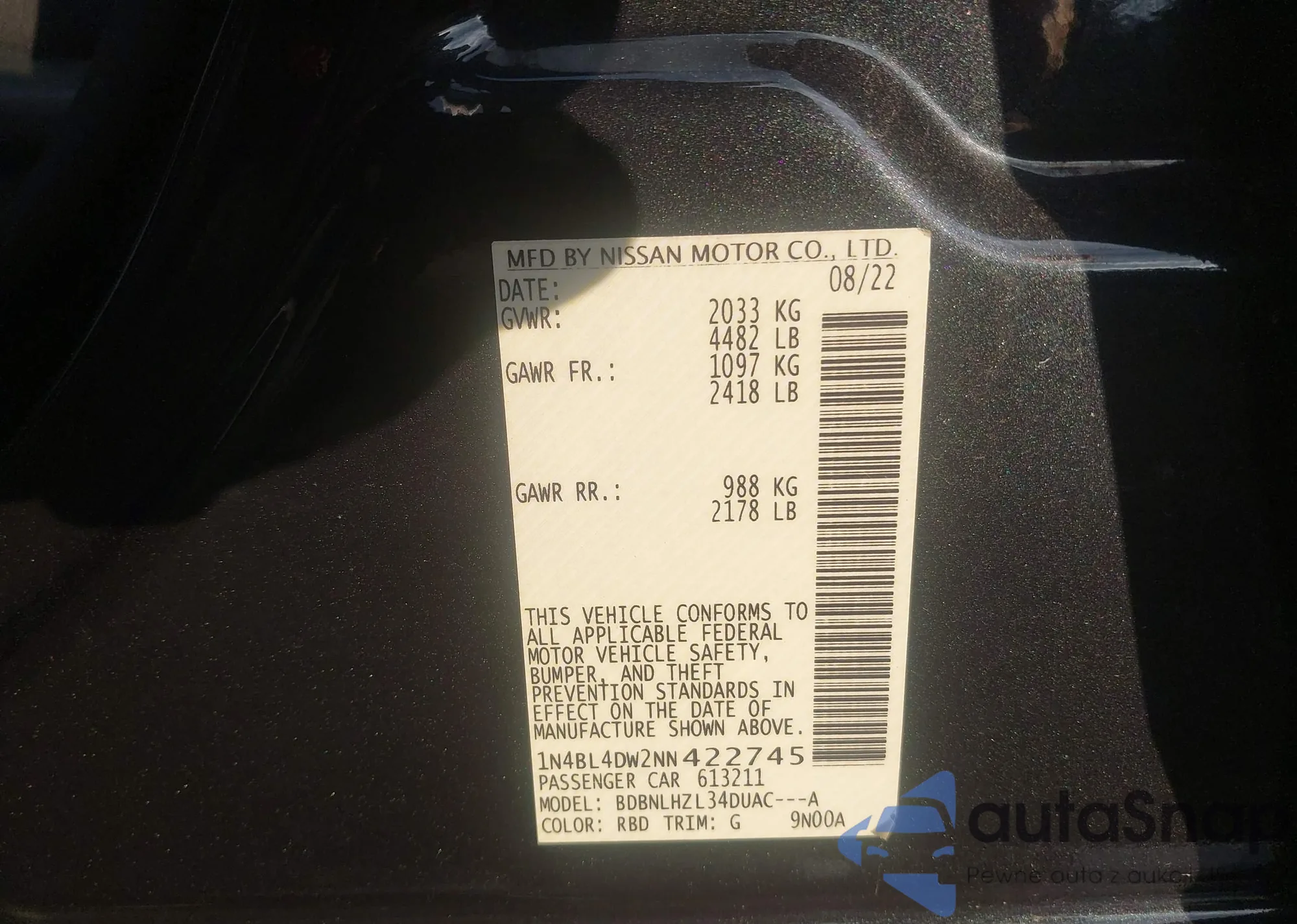 LOT: 42744497 VIN: 1N4BL4DW2NN422745