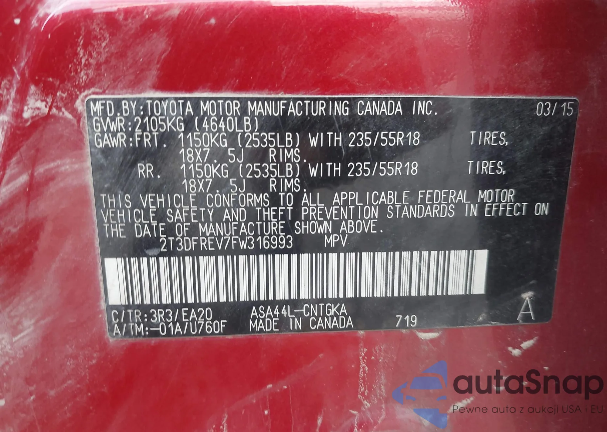 2015 Toyota Rav4 Limited из США, поврежденный, VIN 2T3DFREV7FW316993