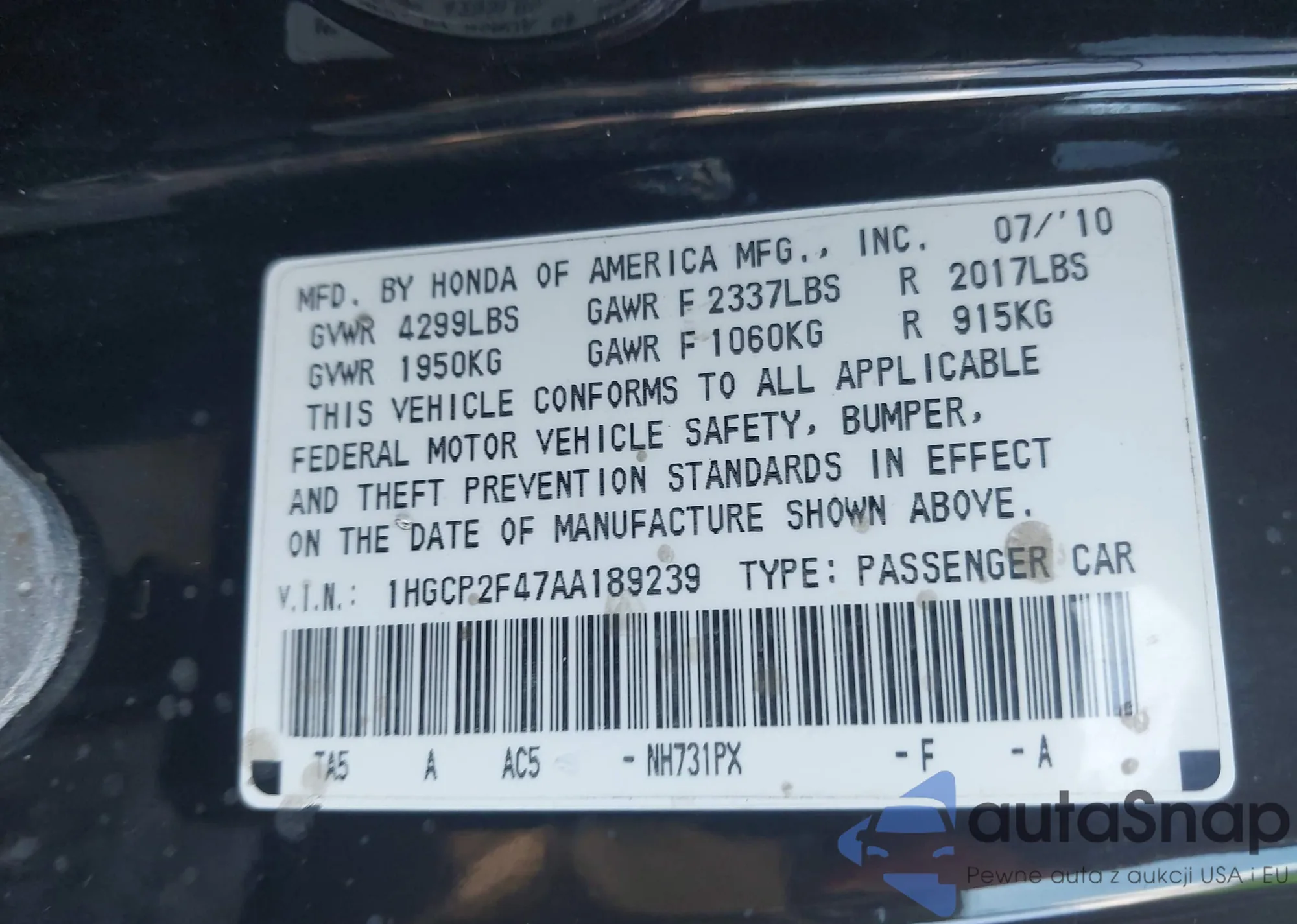 LOT: 42810428 VIN: 1HGCP2F47AA189239