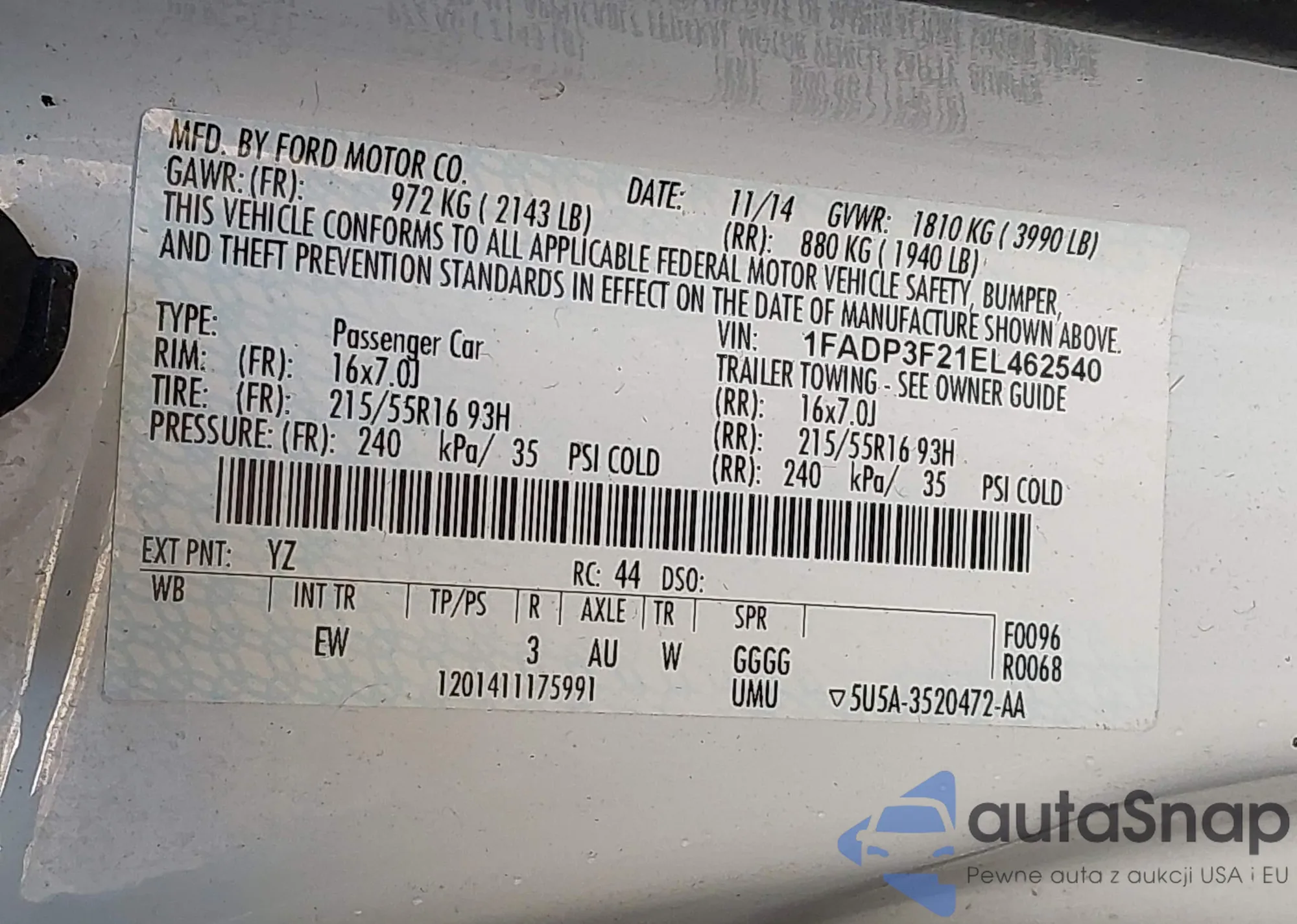 LOT: 42977258 VIN: 1FADP3F21EL462540