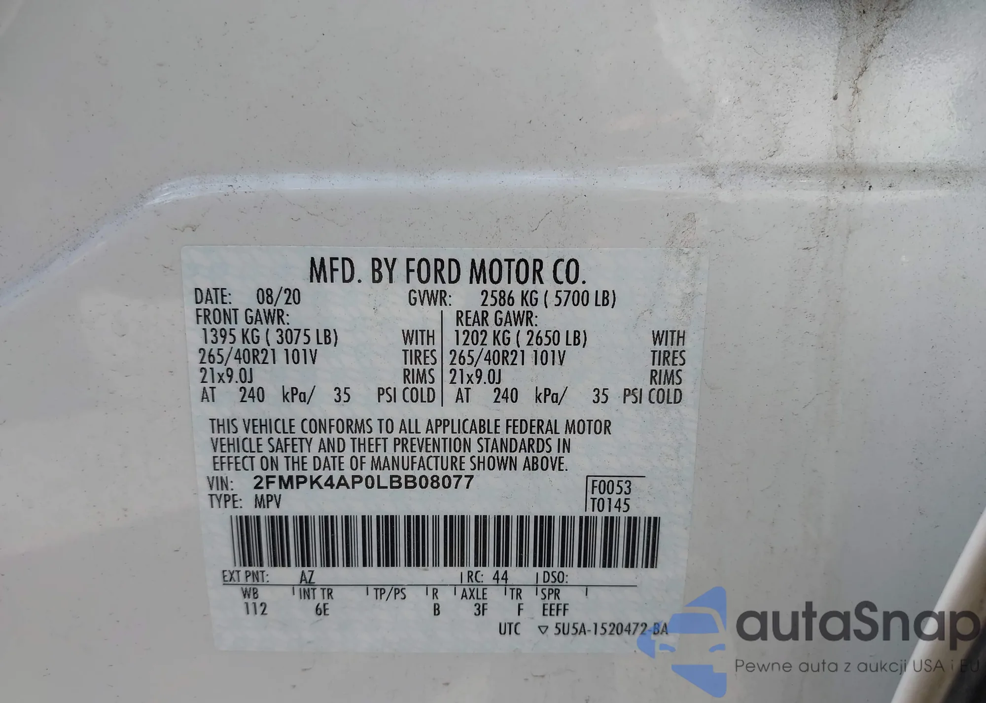 LOT: 43008845 VIN: 5YFT4MCE0MP081819