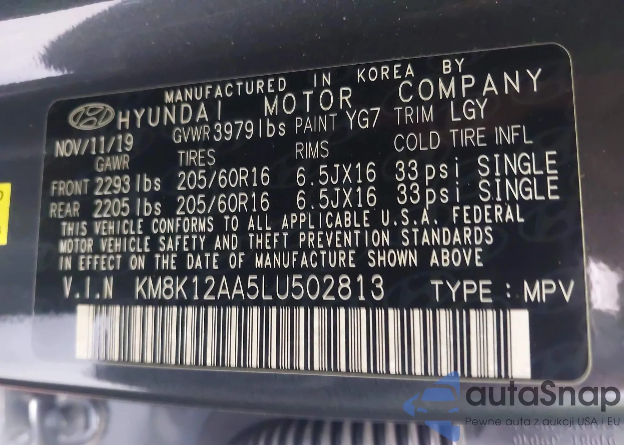 • VIN KM8K12AA5LU502813