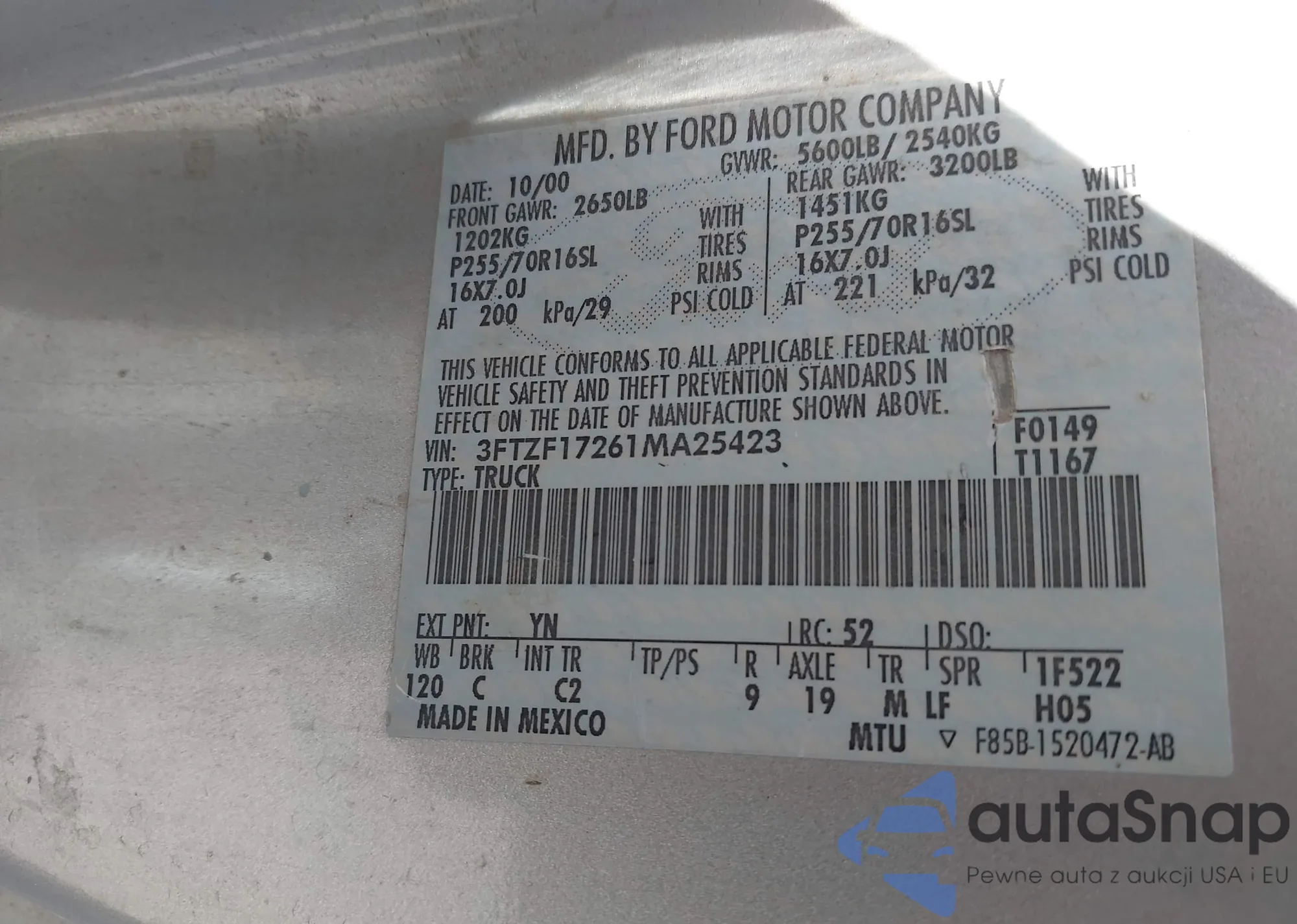 • VIN 3FTZF17261MA25423
