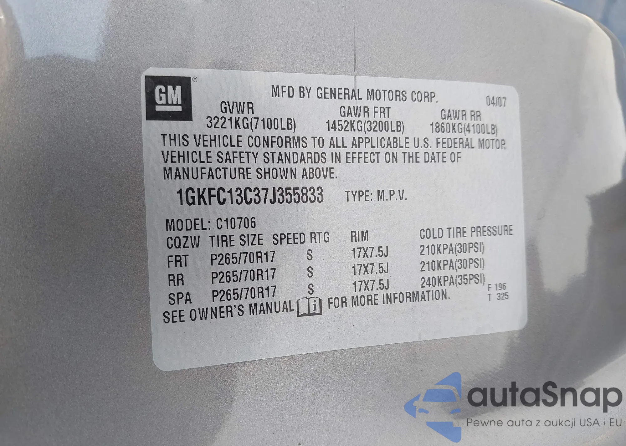 LOT: 43177580 VIN: 1GKFC13C37J355833