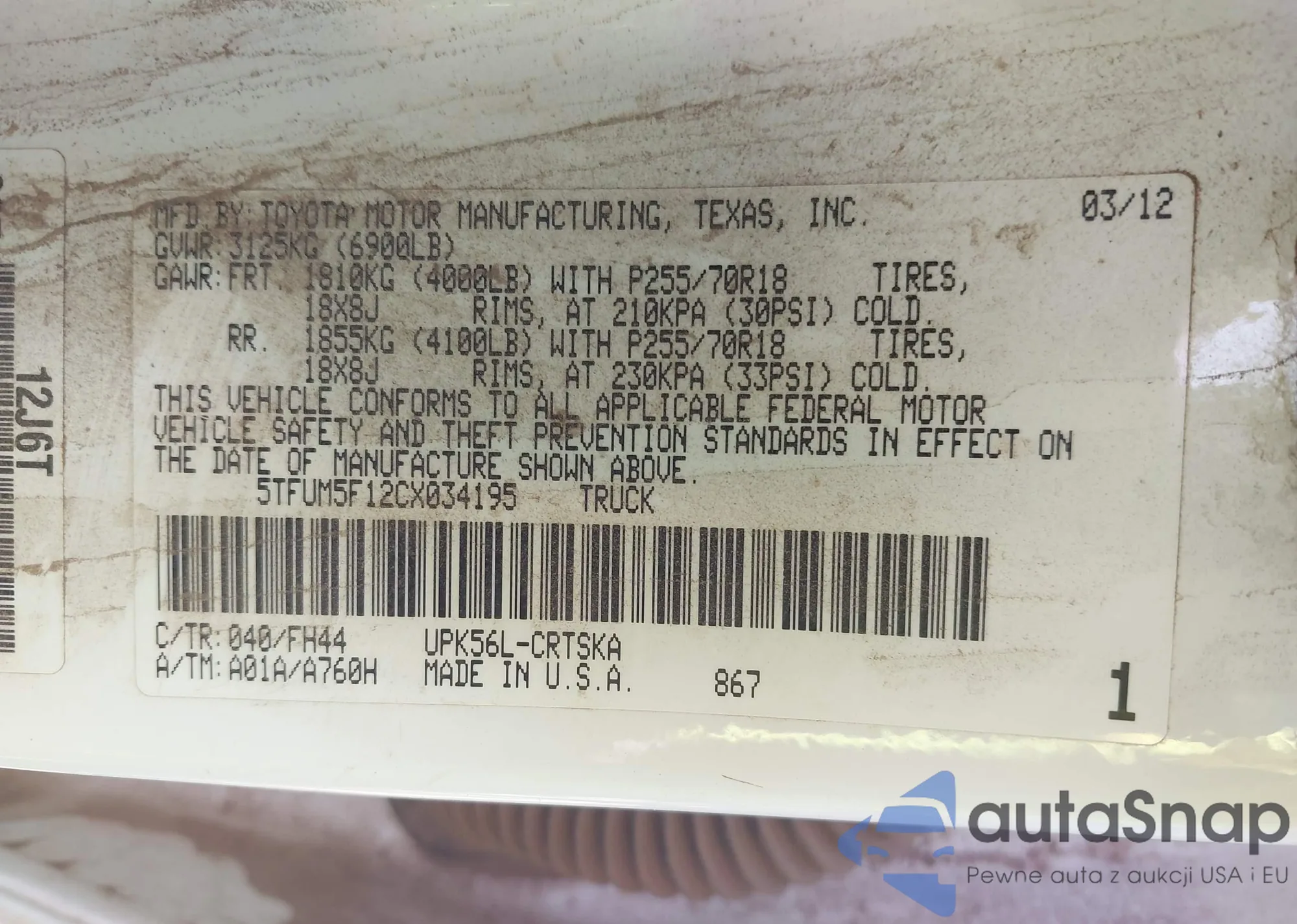 LOT: 43163528 VIN: 5TFUM5F12CX034195