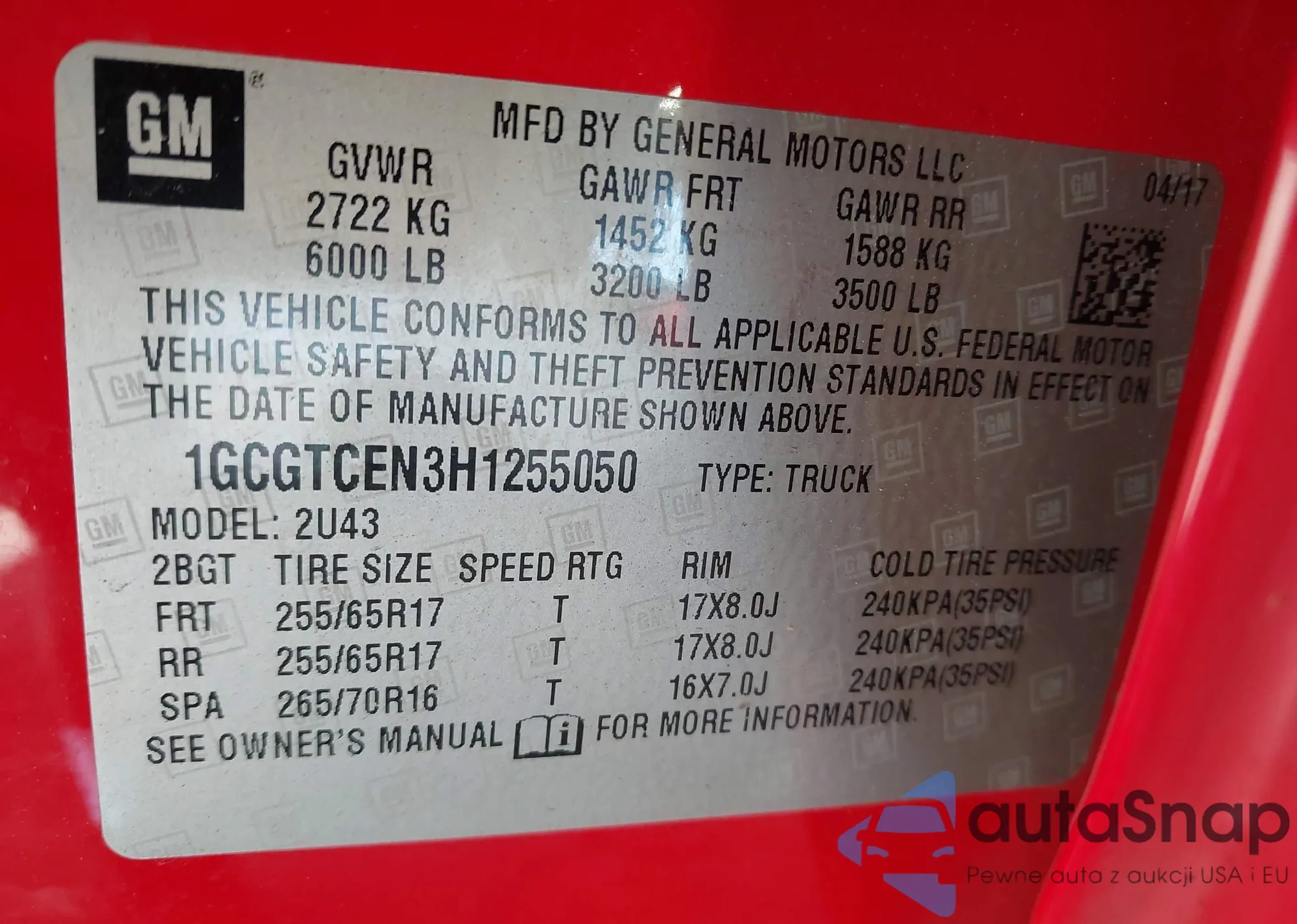 LOT: 42550537 VIN: 1GCGTCEN3H1255050