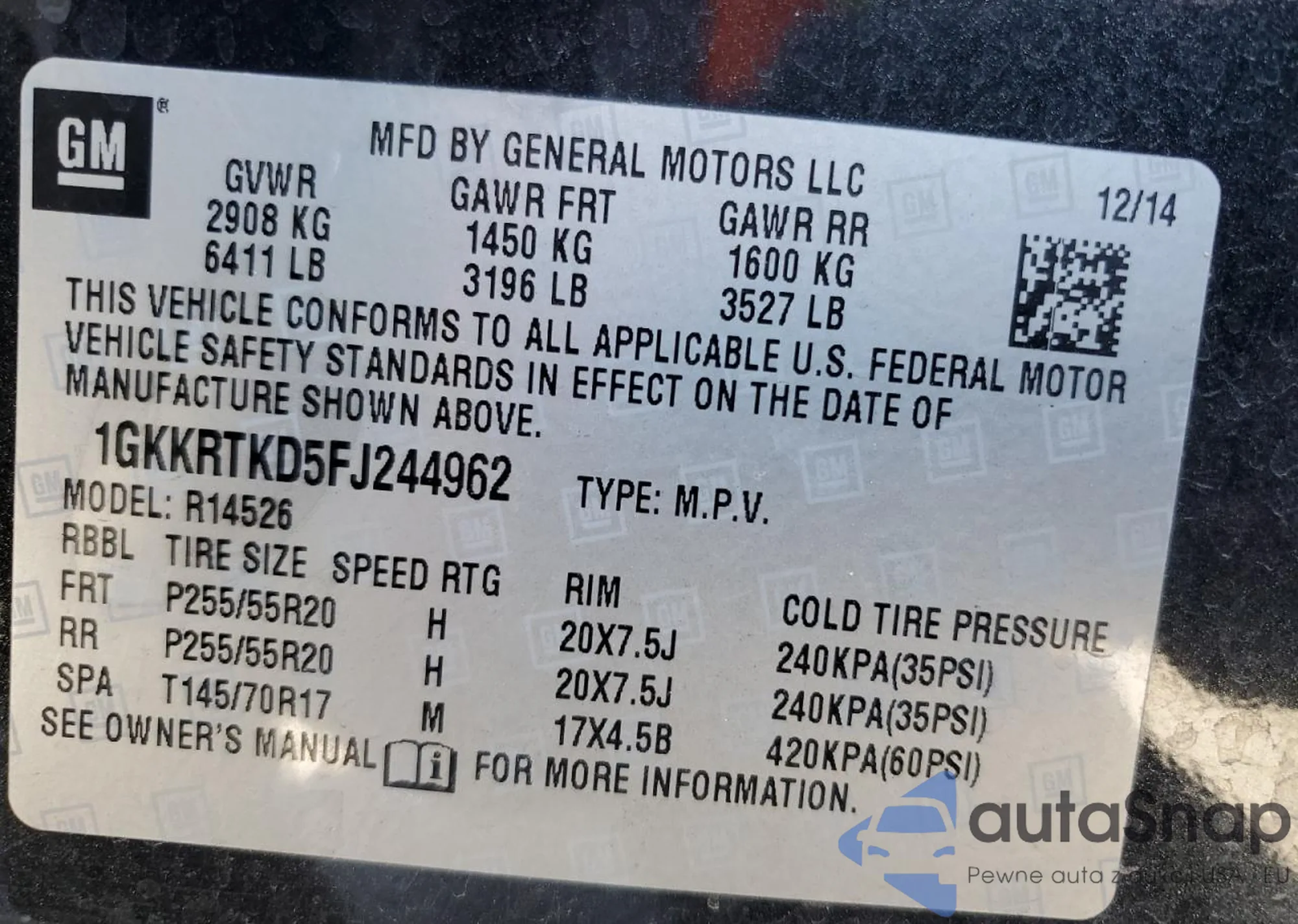 • VIN 1GKKRTKD5FJ244962
