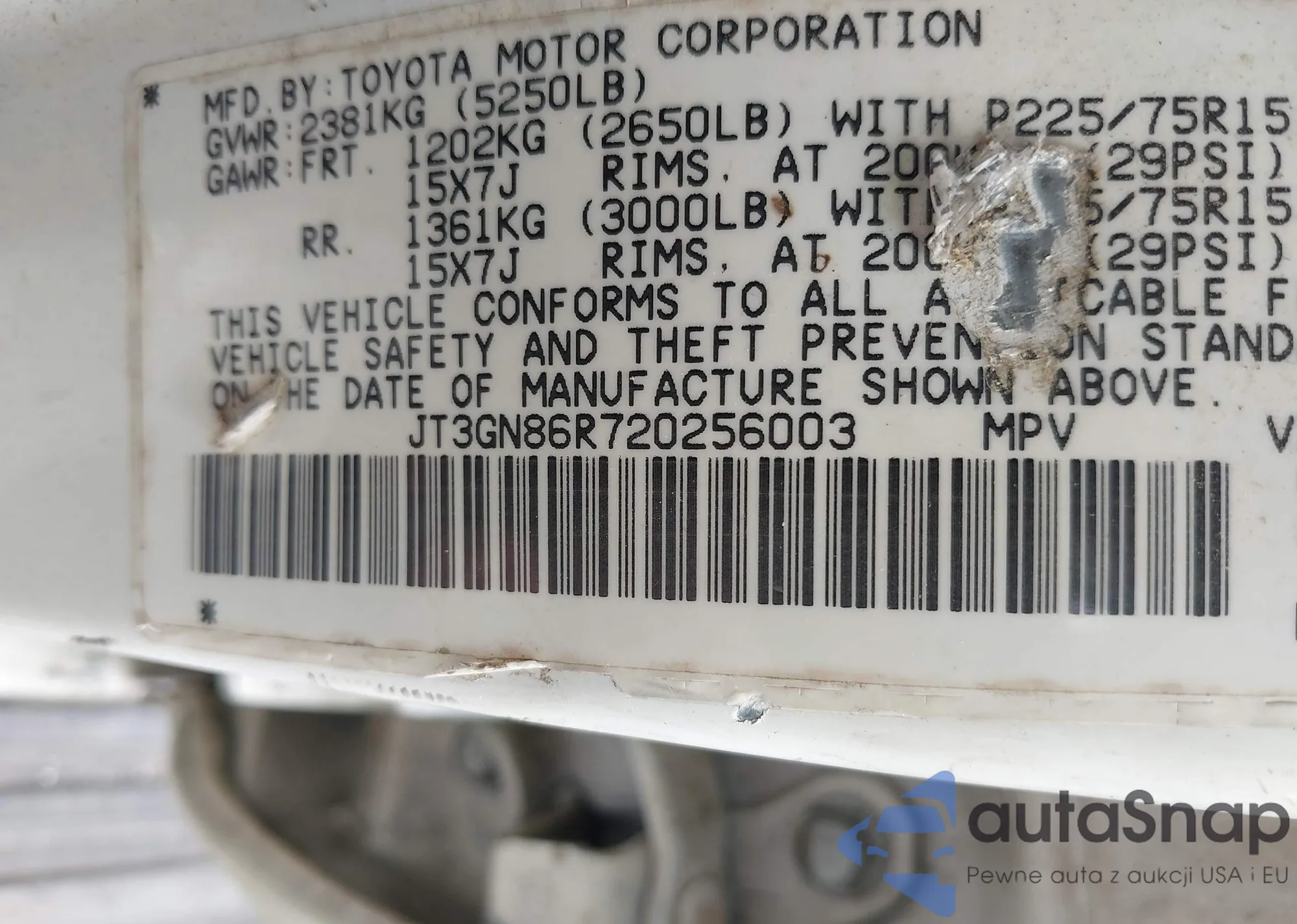 LOT: 42881352 VIN: 2T3RFREV9HW637460