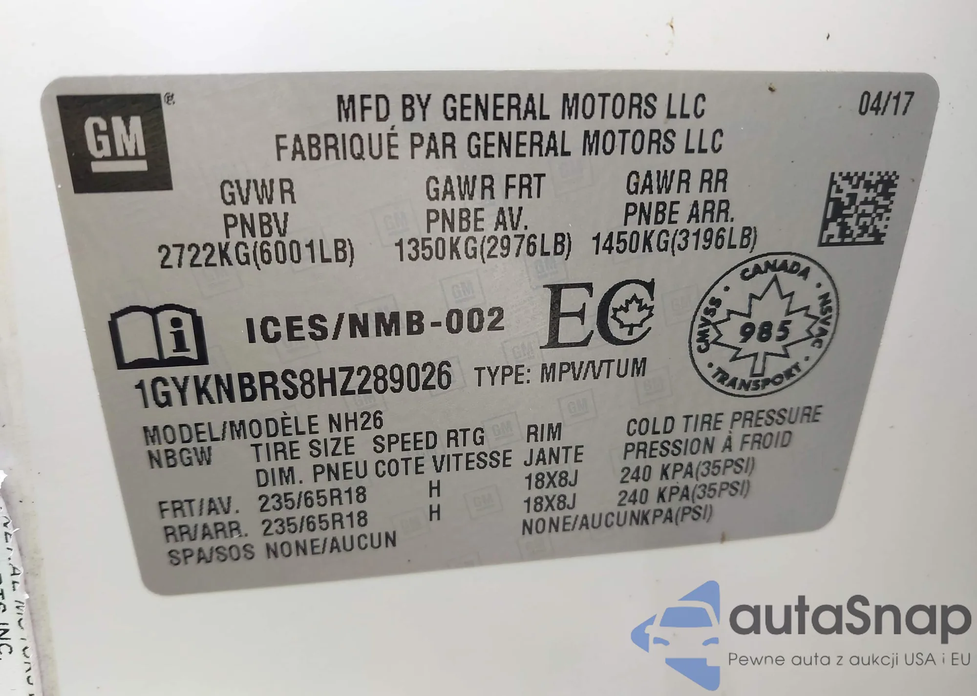 LOT: 42617573 VIN: 1GYKNBRS8HZ289026