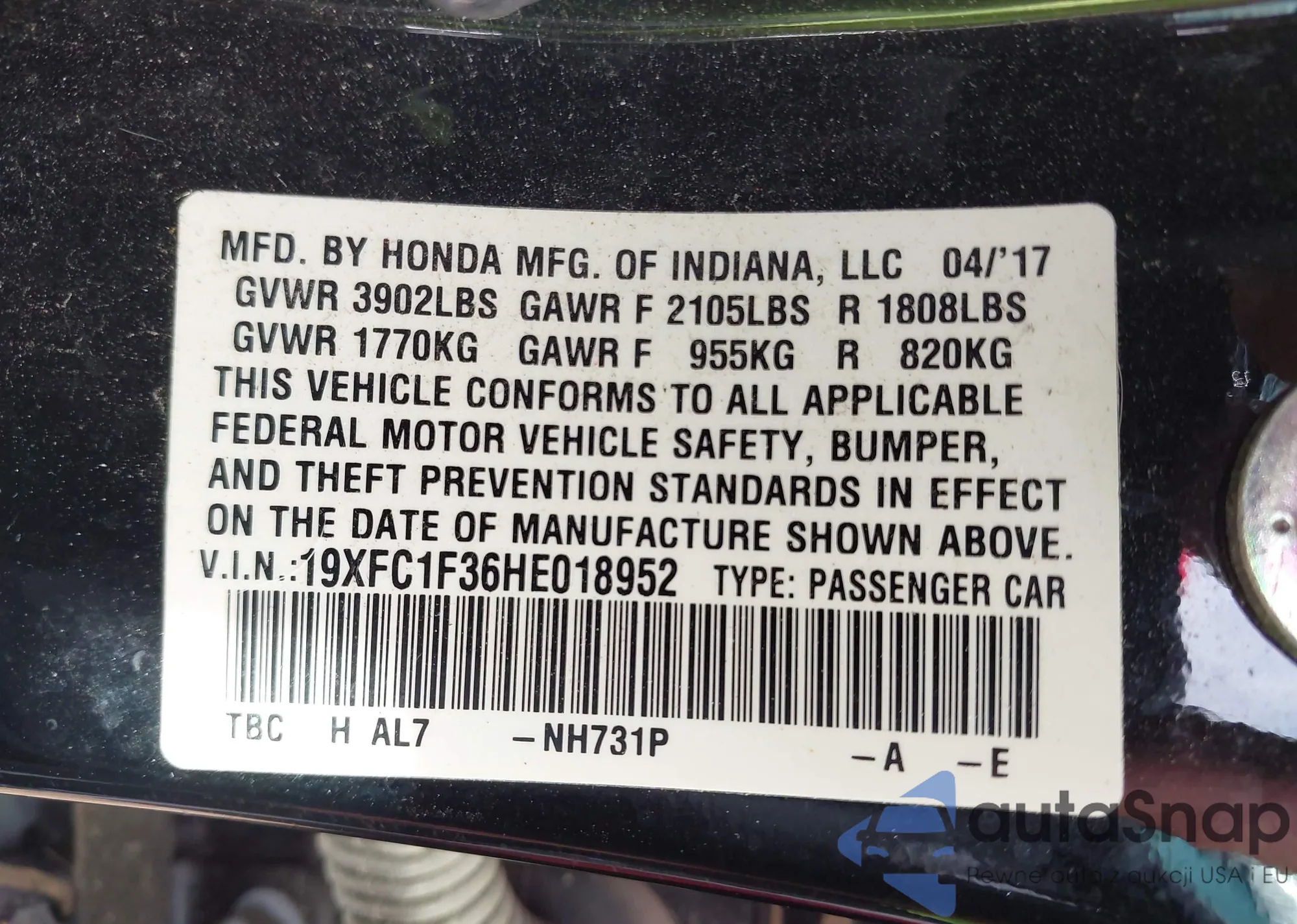 • VIN 19XFC1F36HE018952