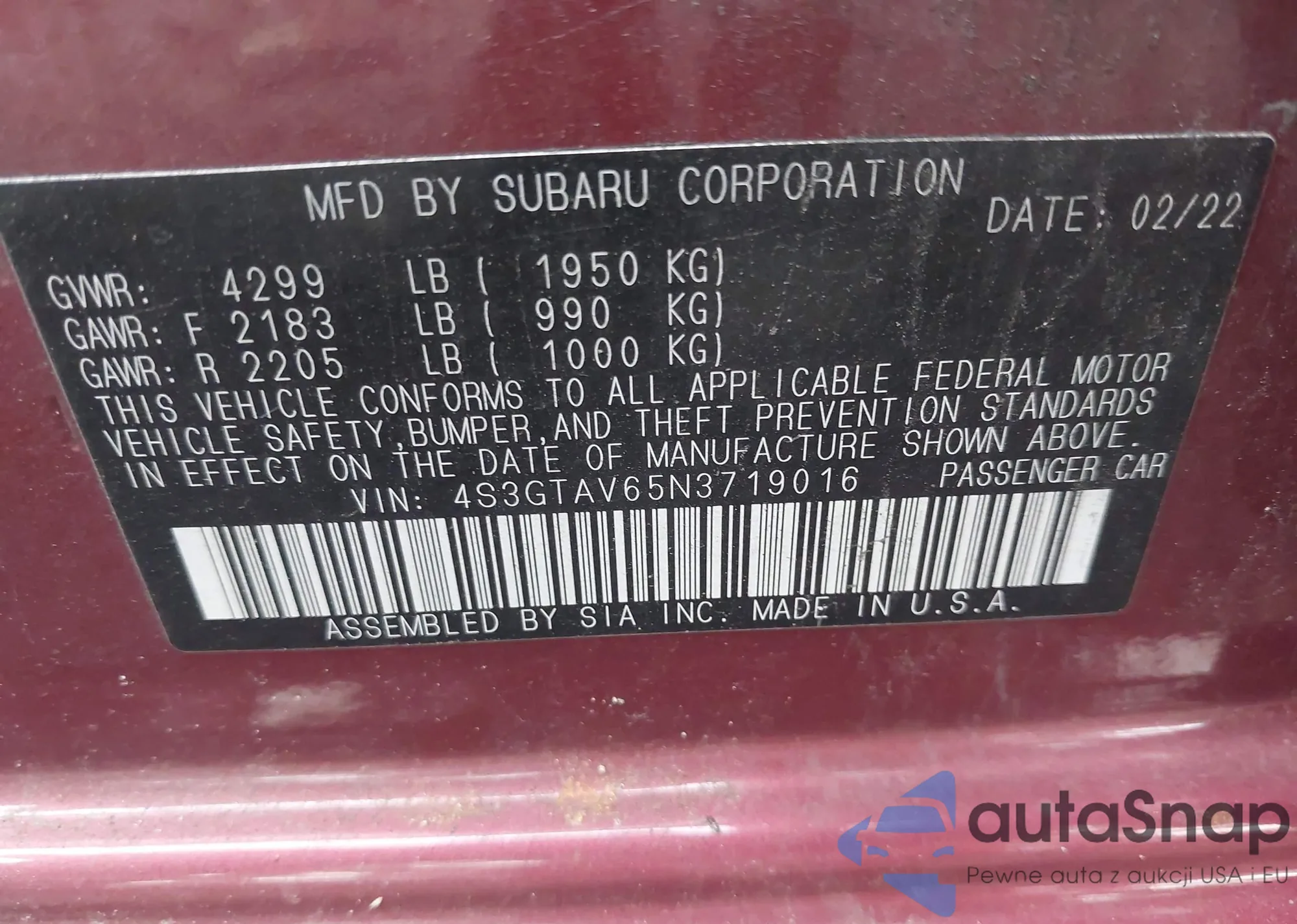 • VIN 4S3GTAV65N3719016