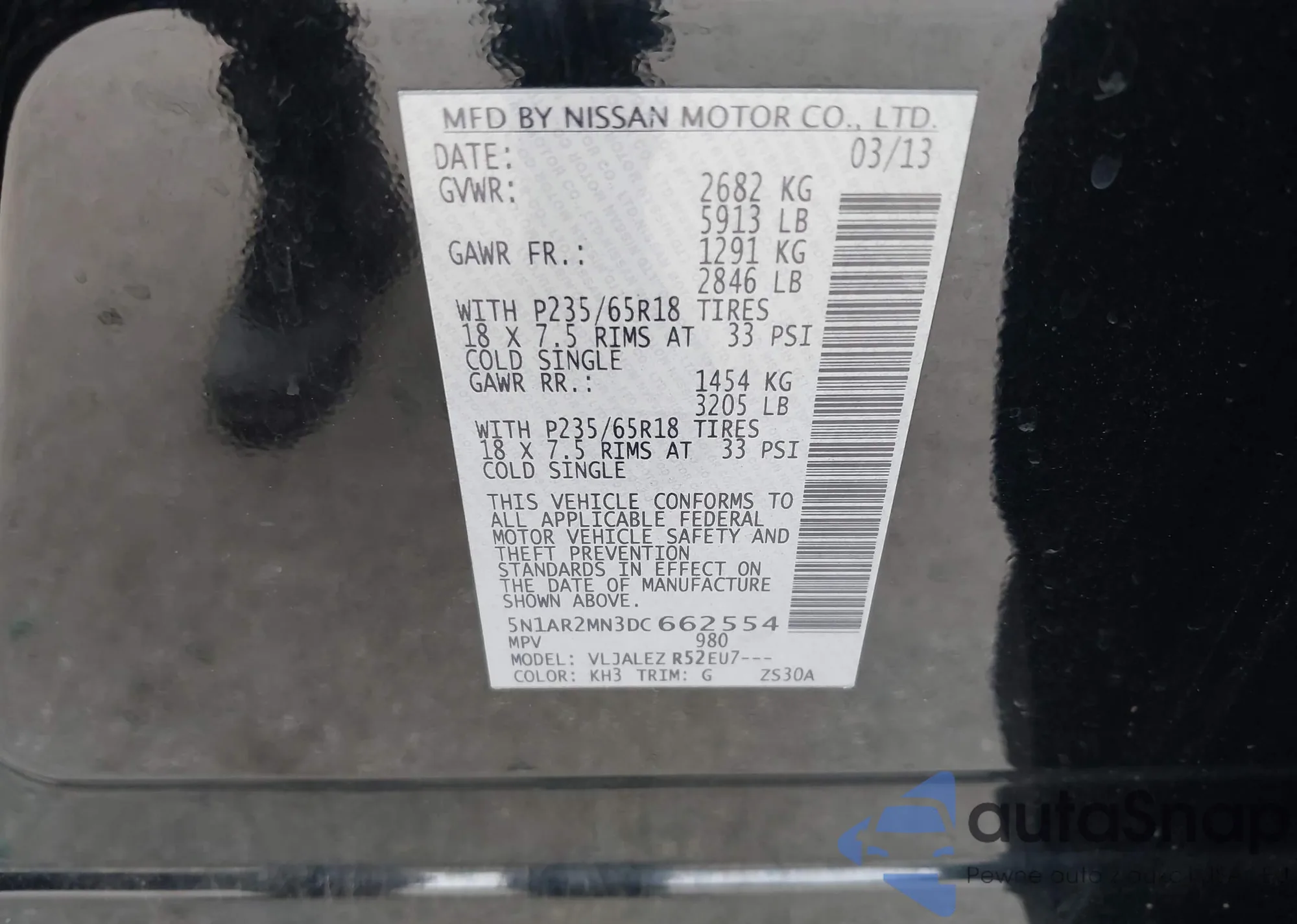 LOT: 43061249 VIN: 5N1AR2MN3DC662554