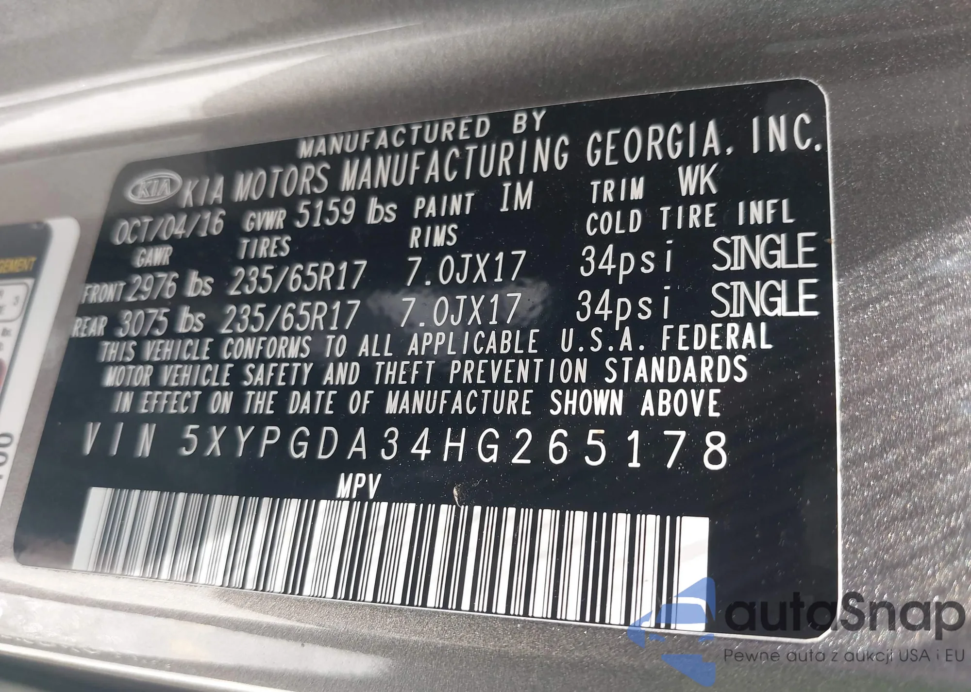 • VIN 5XYPGDA34HG265178