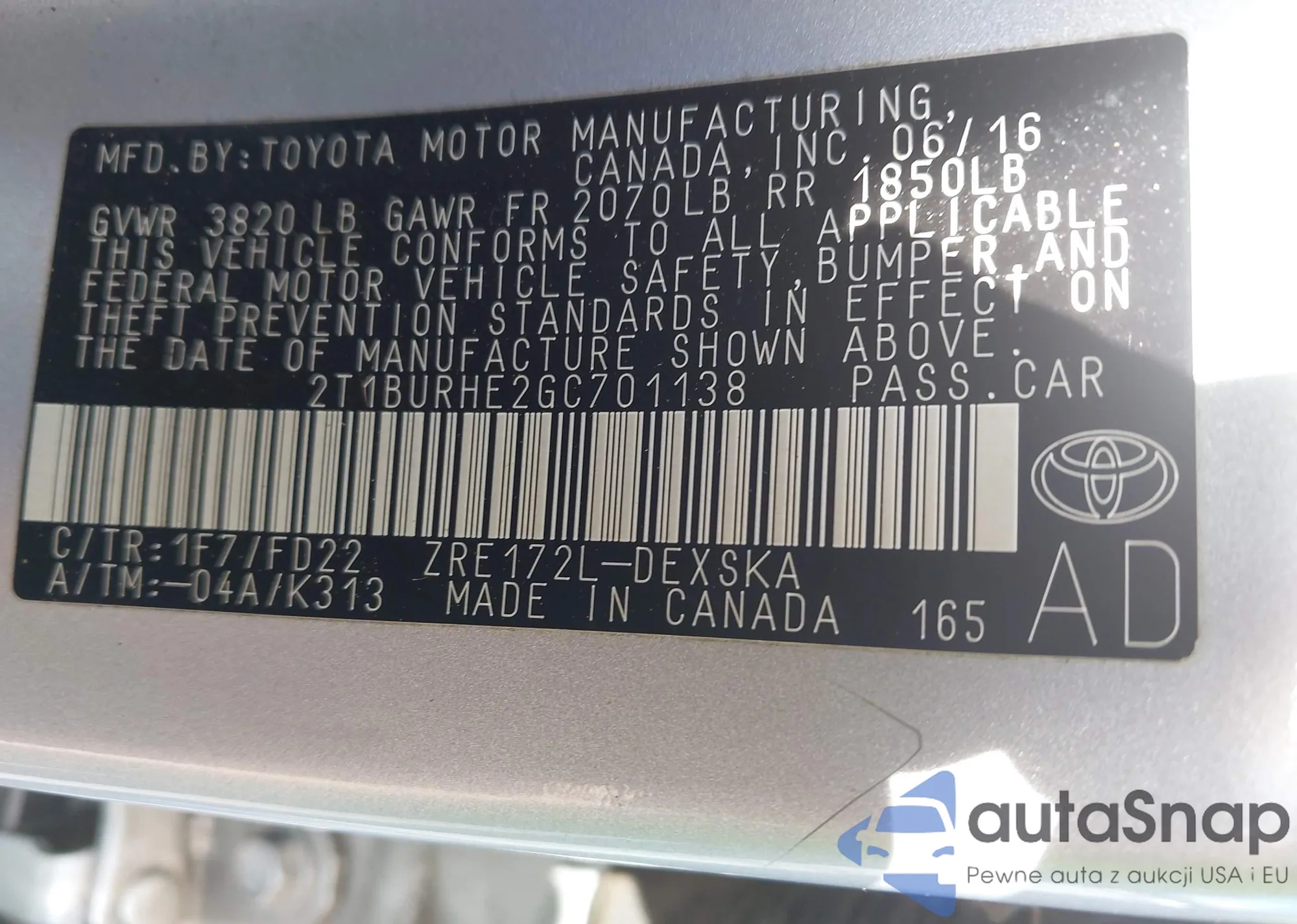 LOT: 42869040 VIN: 2T1BURHE2GC701138