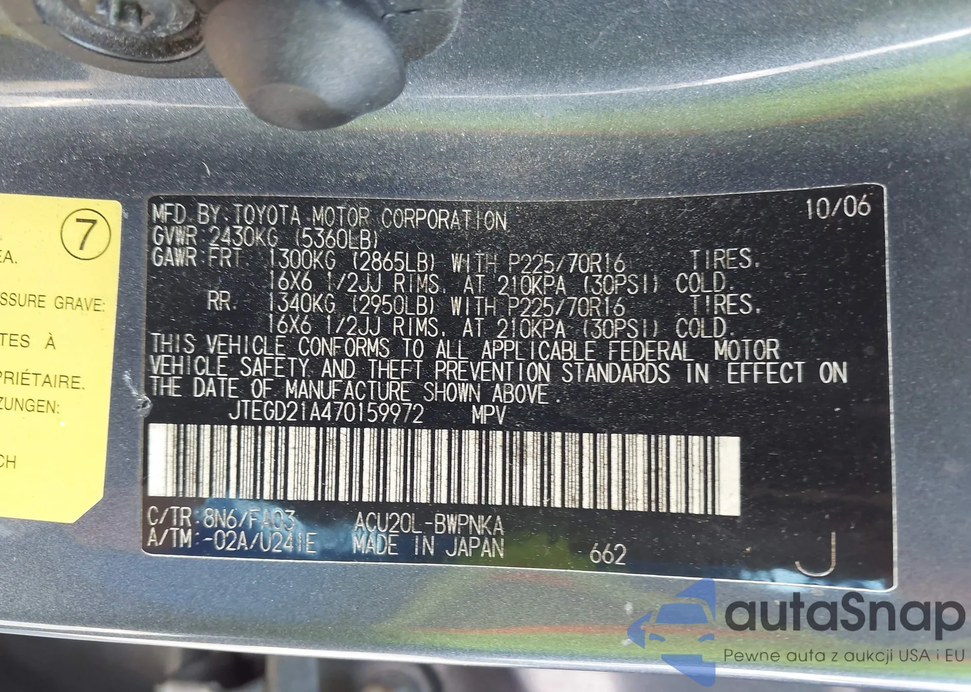 LOT: 43040805 VIN: JTEGD21A470159972