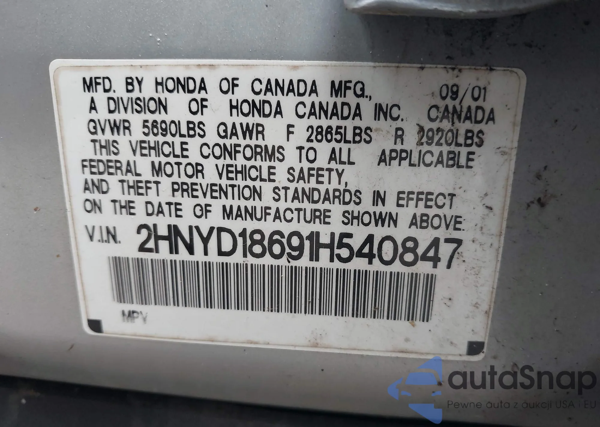 LOT: 43045148 VIN: 2HNYD18691H540847