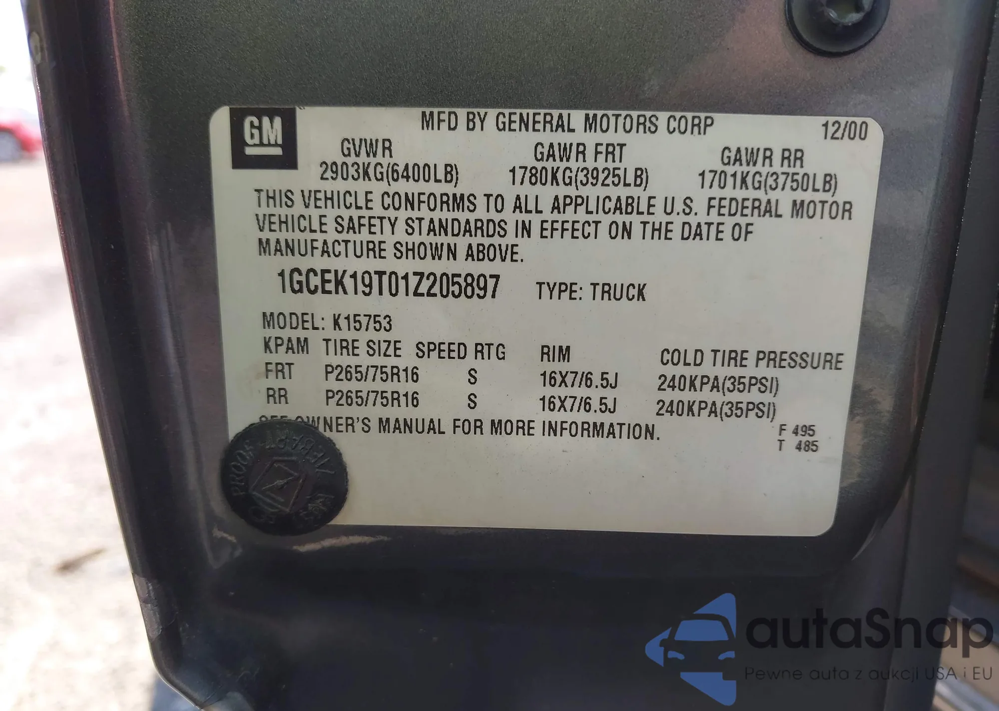 LOT: 43063825 VIN: 1GCEK19T01Z205897