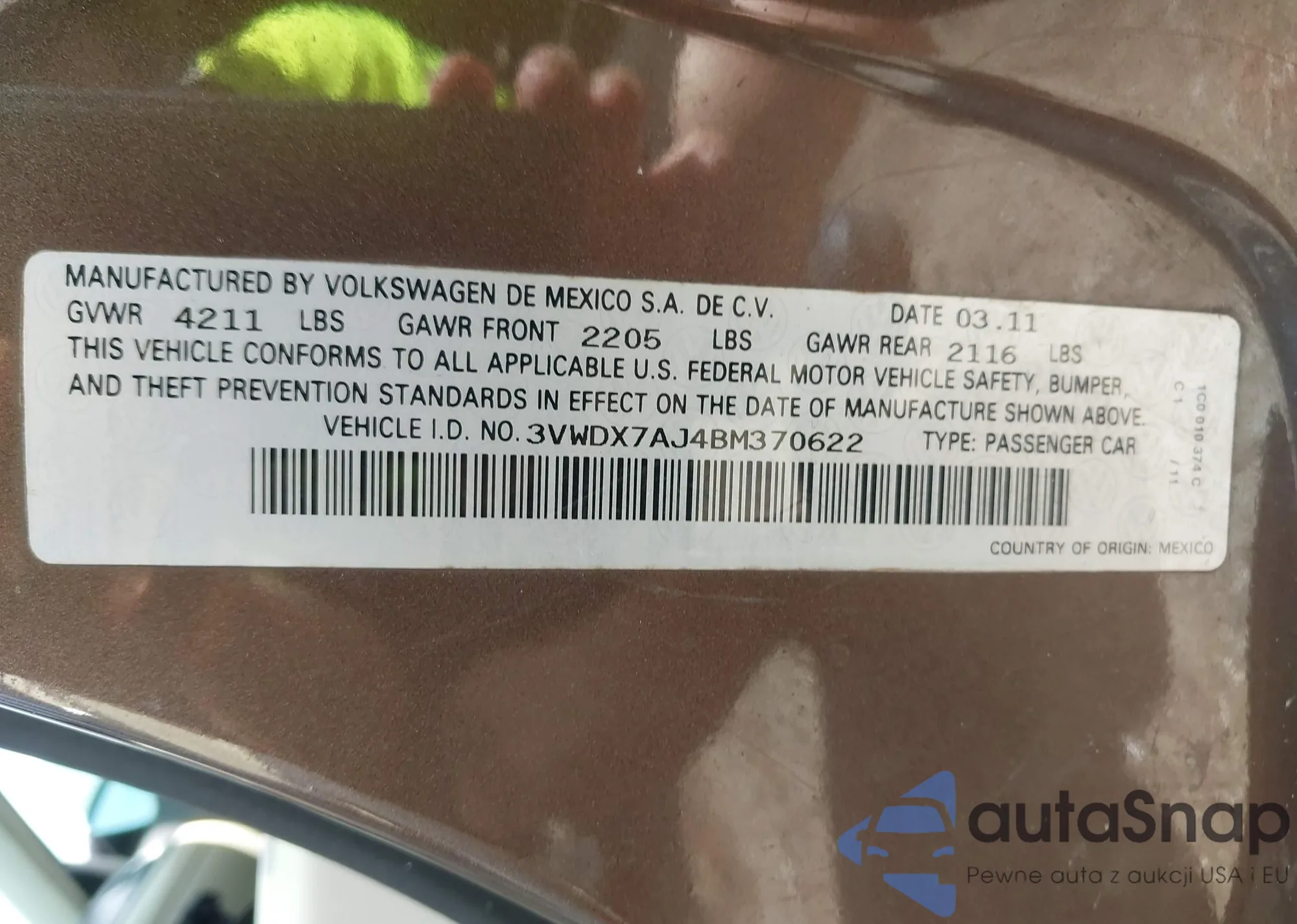 • VIN 3VWDX7AJ4BM370622