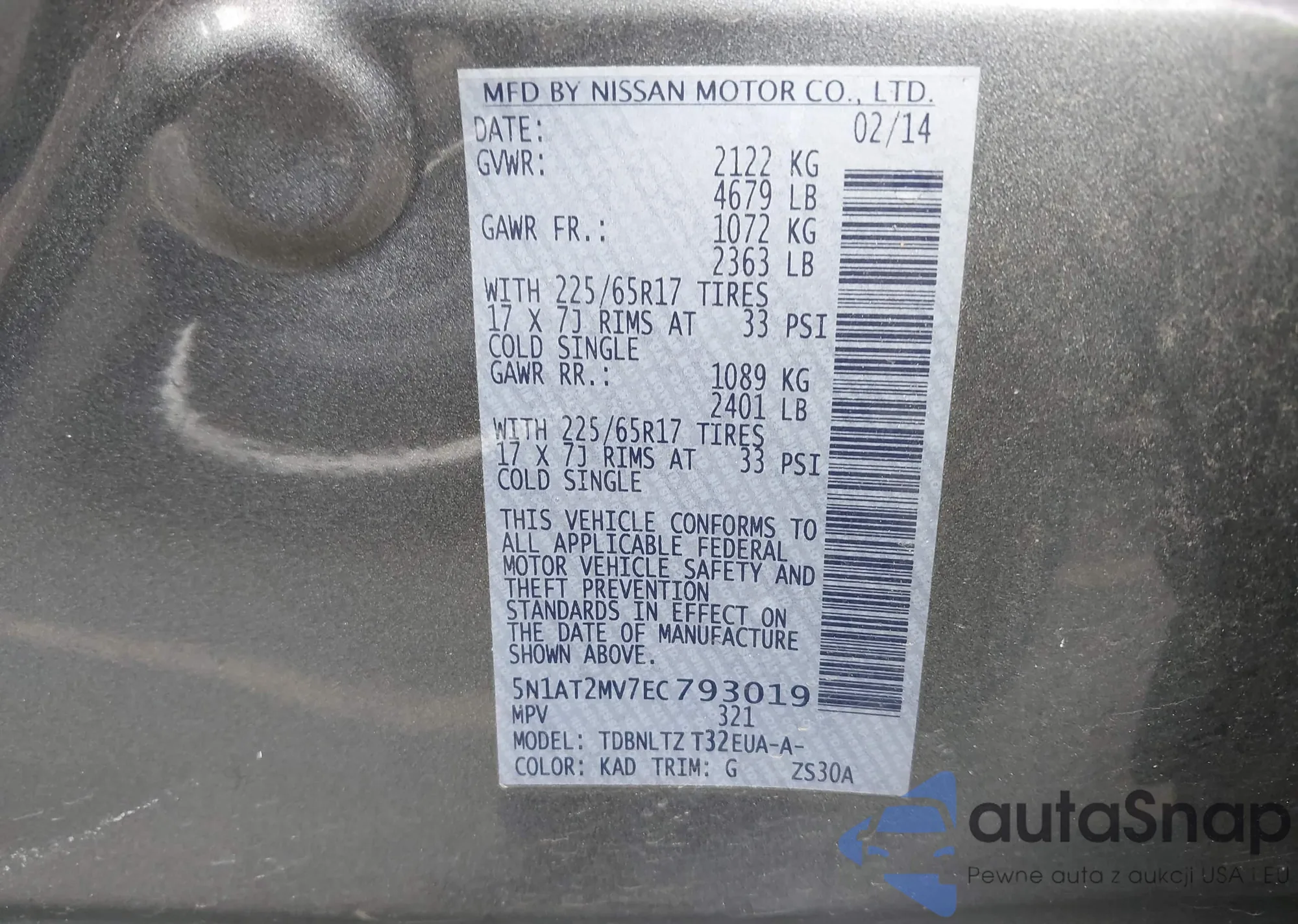 LOT: 42947076 VIN: 5N1AT2MV7EC793019
