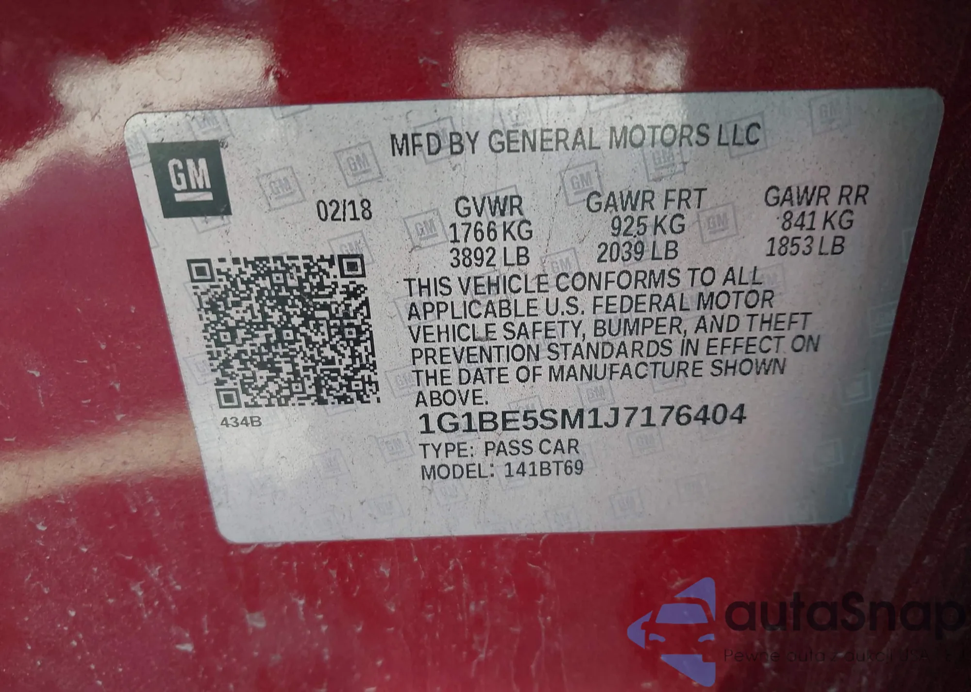 LOT: 42993526 VIN: 1G1BE5SM1J7176404