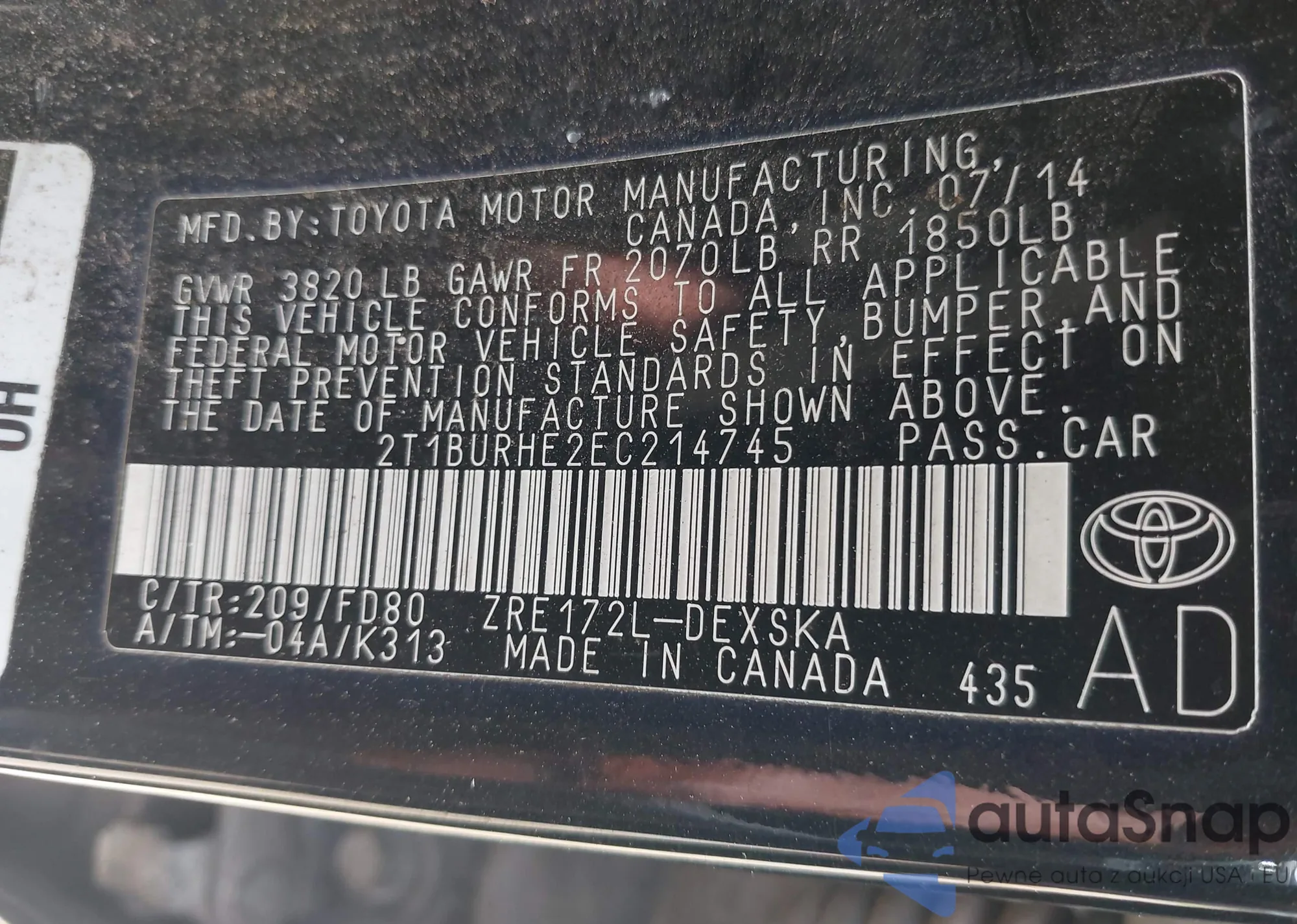 LOT: 42645389 VIN: 2T1BURHE2EC214745