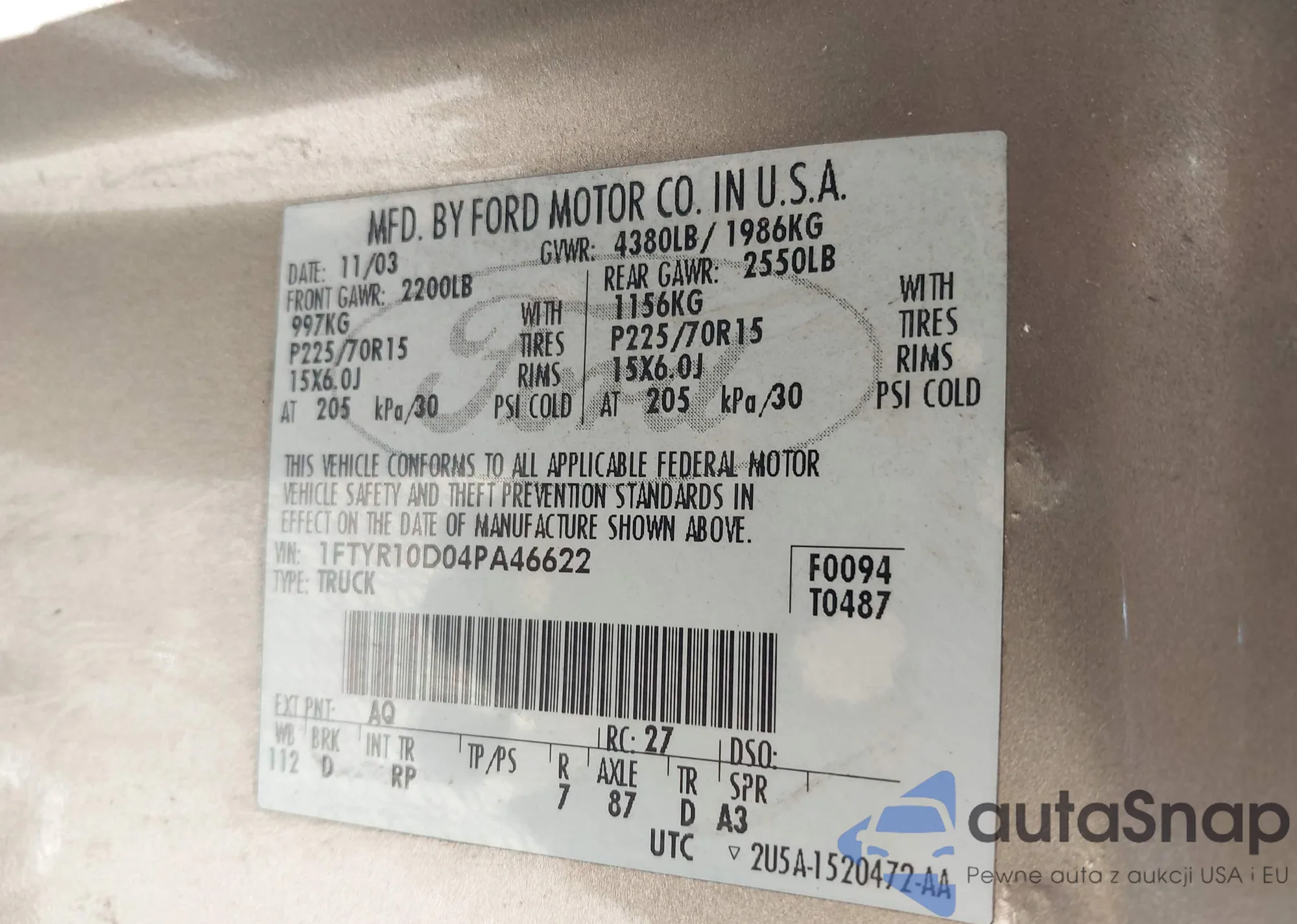 LOT: 43173302 VIN: 1FTYR10D04PA46622