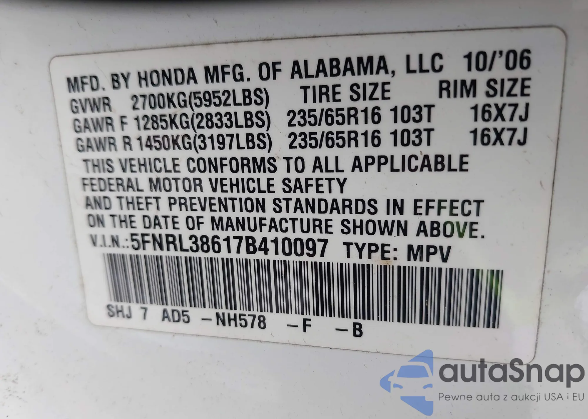 LOT: 43172496 VIN: SHHEP33535U500851