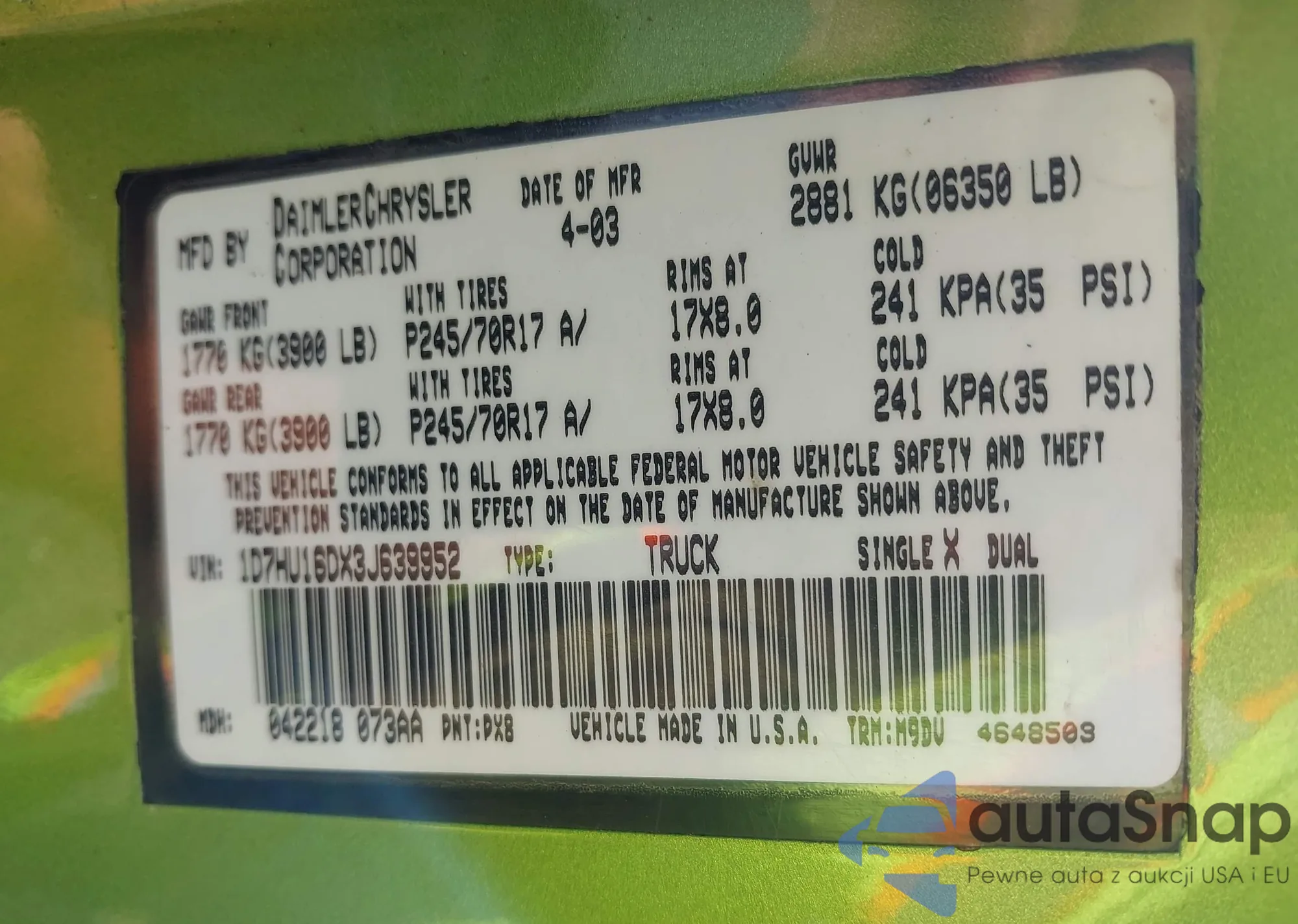 • VIN 1D7HU16DX3J639952