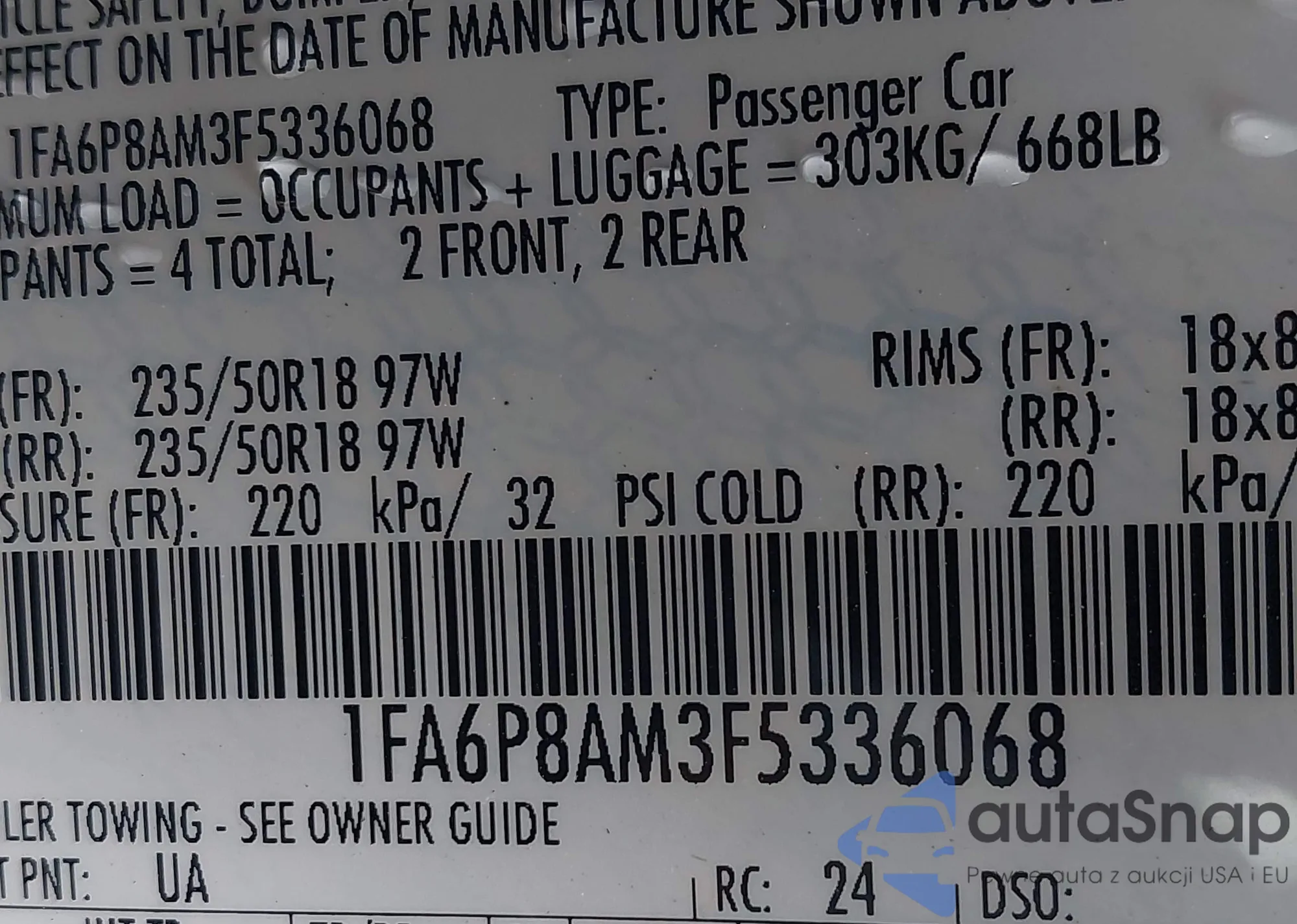 LOT: 43069258 VIN: 1FA6P8AM3F5336068