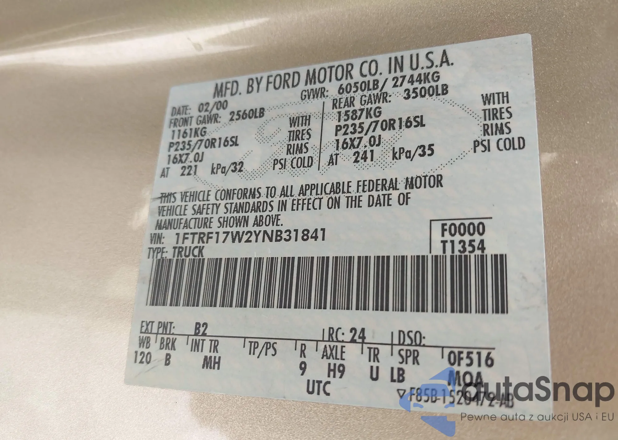 LOT: 43201229 VIN: 1FTRF17W2YNB31841