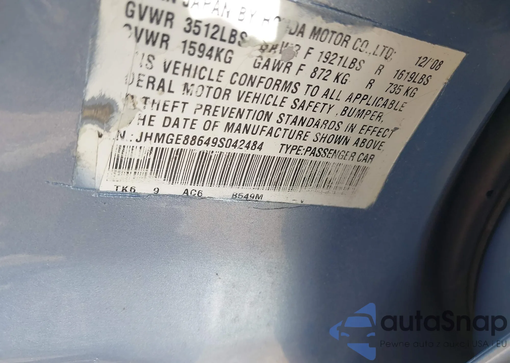 LOT: 43054575 VIN: JHMGE88649S042484