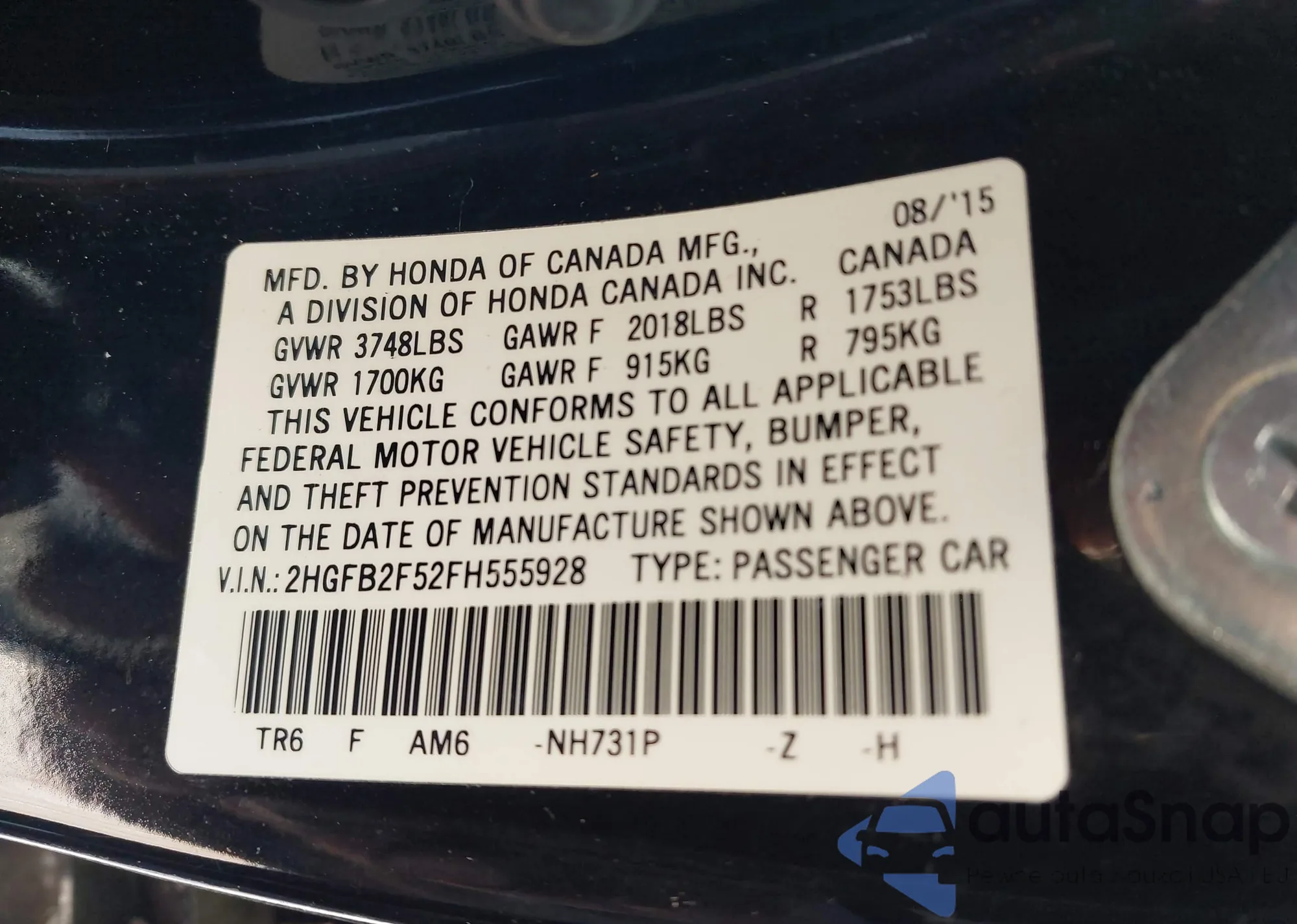 LOT: 43167353 VIN: 2HGFB2F52FH555928
