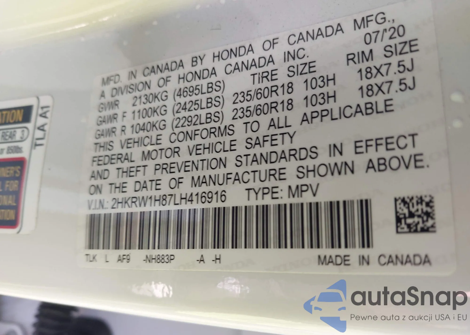 • VIN 2HKRW1H87LH416916