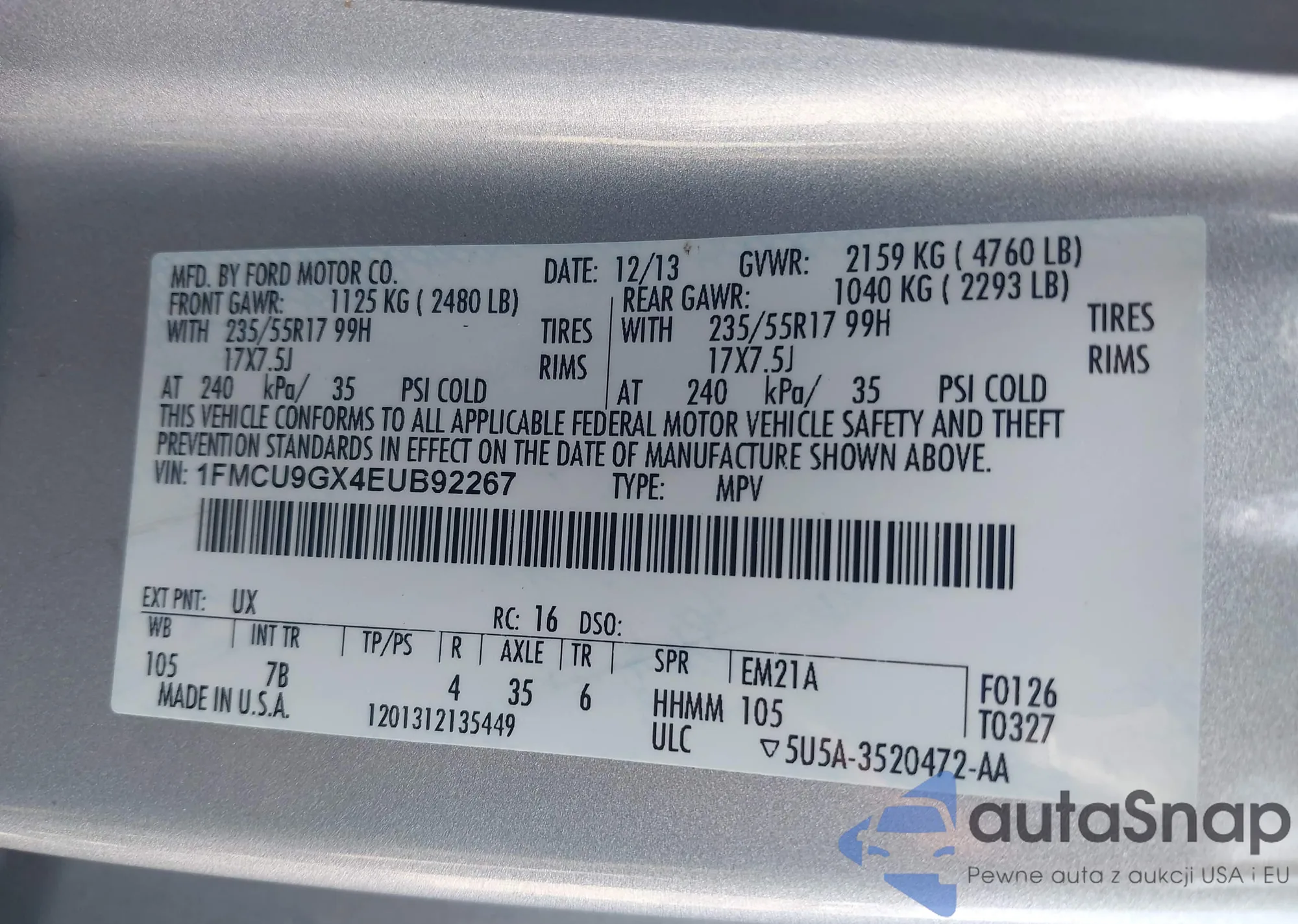 LOT: 43141314 VIN: 1FMCU9GX4EUB92267